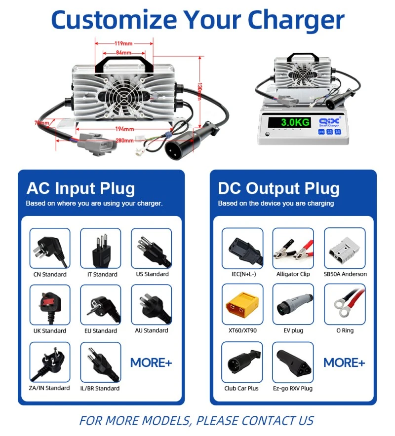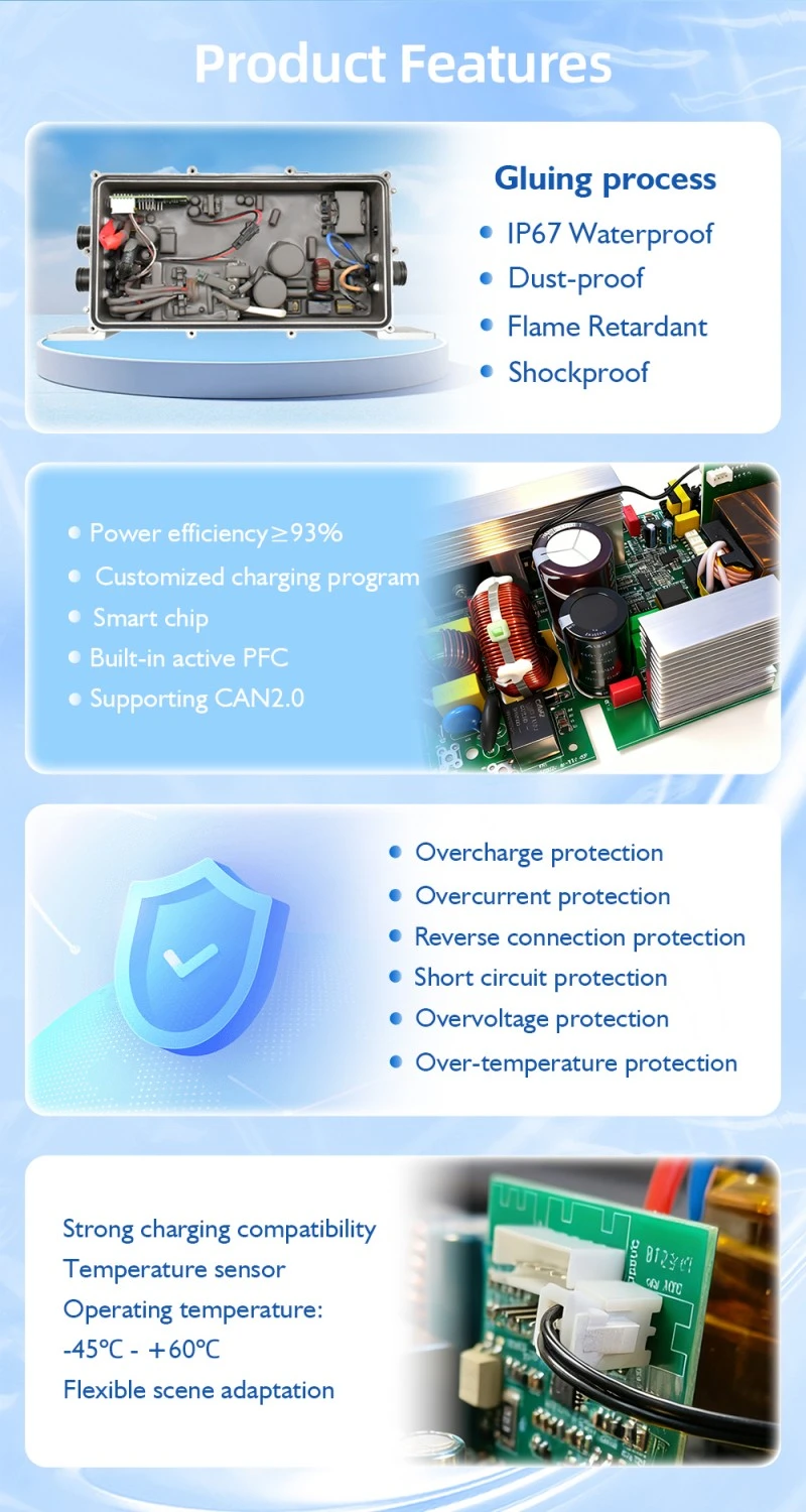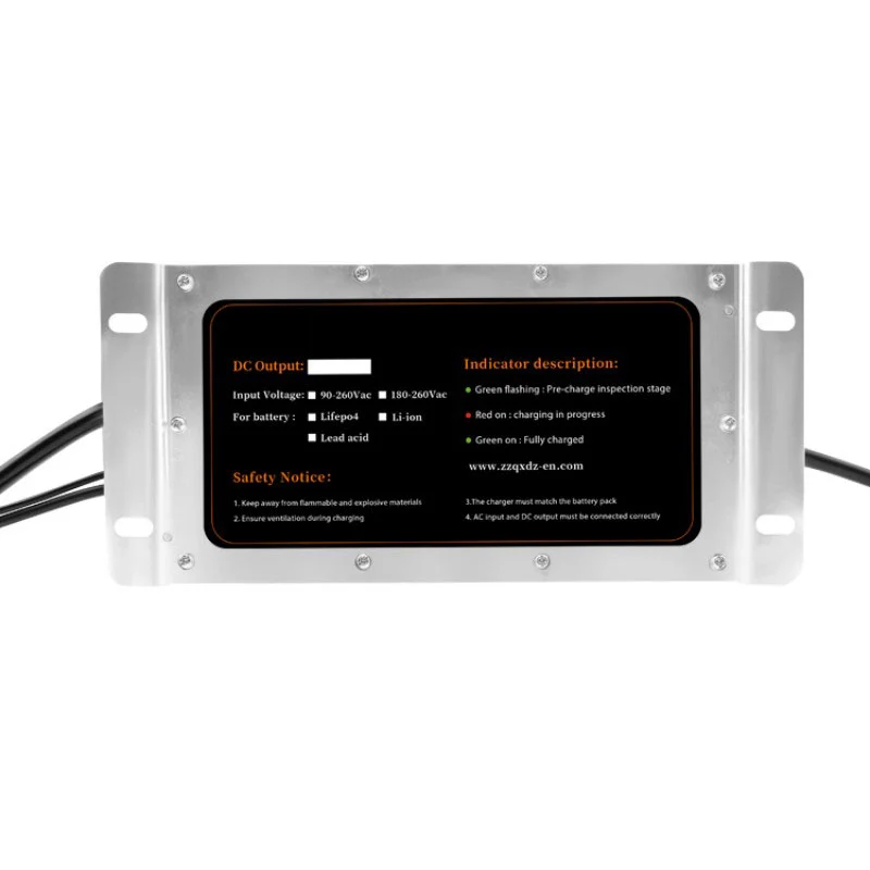 Tämä Kiinassa valmistettu 1,2 kW:n OBC-laturien akkulaturi on laajalla 90–260 V AC:n tulojännitealueella yhteensopiva sähköverkkojen kanssa kaikilla alueilla ympäri maailmaa, joten kansainväliseen käyttöön ei tarvita lisäjännitemuuntajia. Se ylläpitää vakaata 48 V/25 A ulostuloa, vaikka tulojännite vaihtelee (±10 %), mikä varmistaa sähköajoneuvojen, trukkien ja laivavarusteiden 48 V akkujen tasaisen lataustehon.