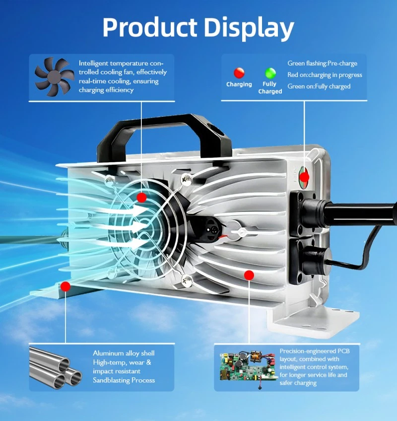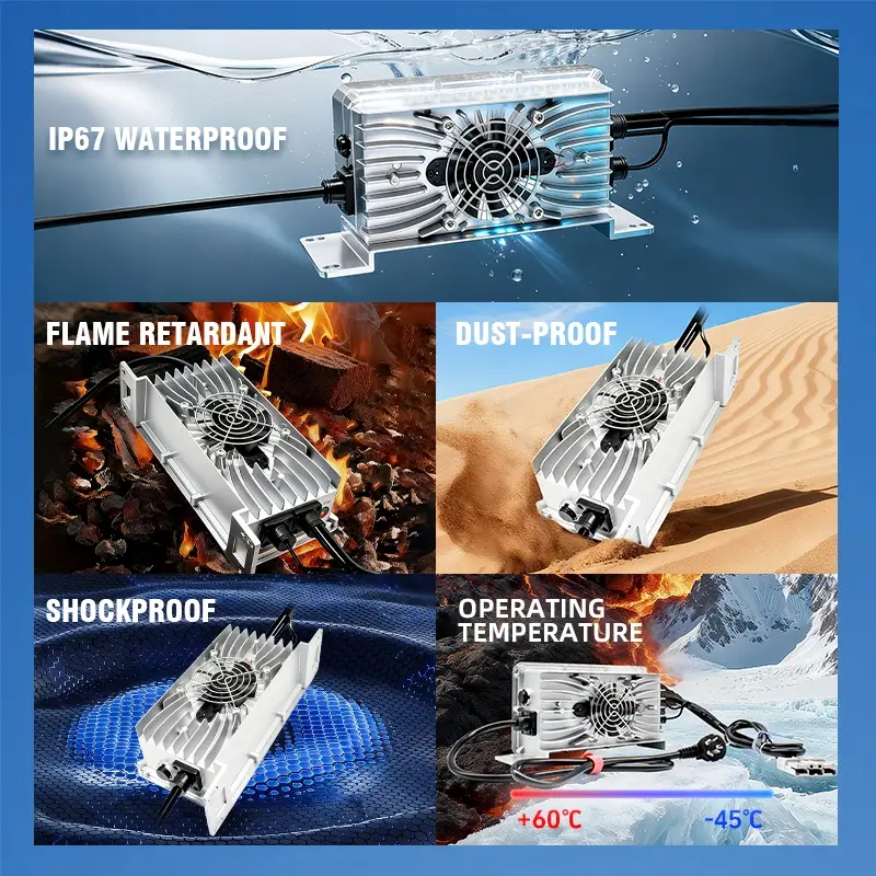 Täysin alumiiniseoksesta valmistettu kuori parantaa lämmönpoistotehokkuutta 35 % muovikuoriin verrattuna pitäen laturin käyttölämpötilan alle 60 ℃ jatkuvan 1,2 kW:n käytön aikana, mikä suojaa sisäisiä komponentteja ja pidentää käyttöikää. Lisäksi se on varustettu monikerroksisilla turvasuojamekanismeilla, mukaan lukien ylijännitesuoja (maks. 55 V), ylivirtasuoja (max. 28 A), oikosulkusuojaus ja ylikuumenemissuoja, joka estää tehokkaasti laturin ja akun vaurioitumisen ja varmistaa turvallisen toiminnan kaikissa ajoneuvoympäristöissä.