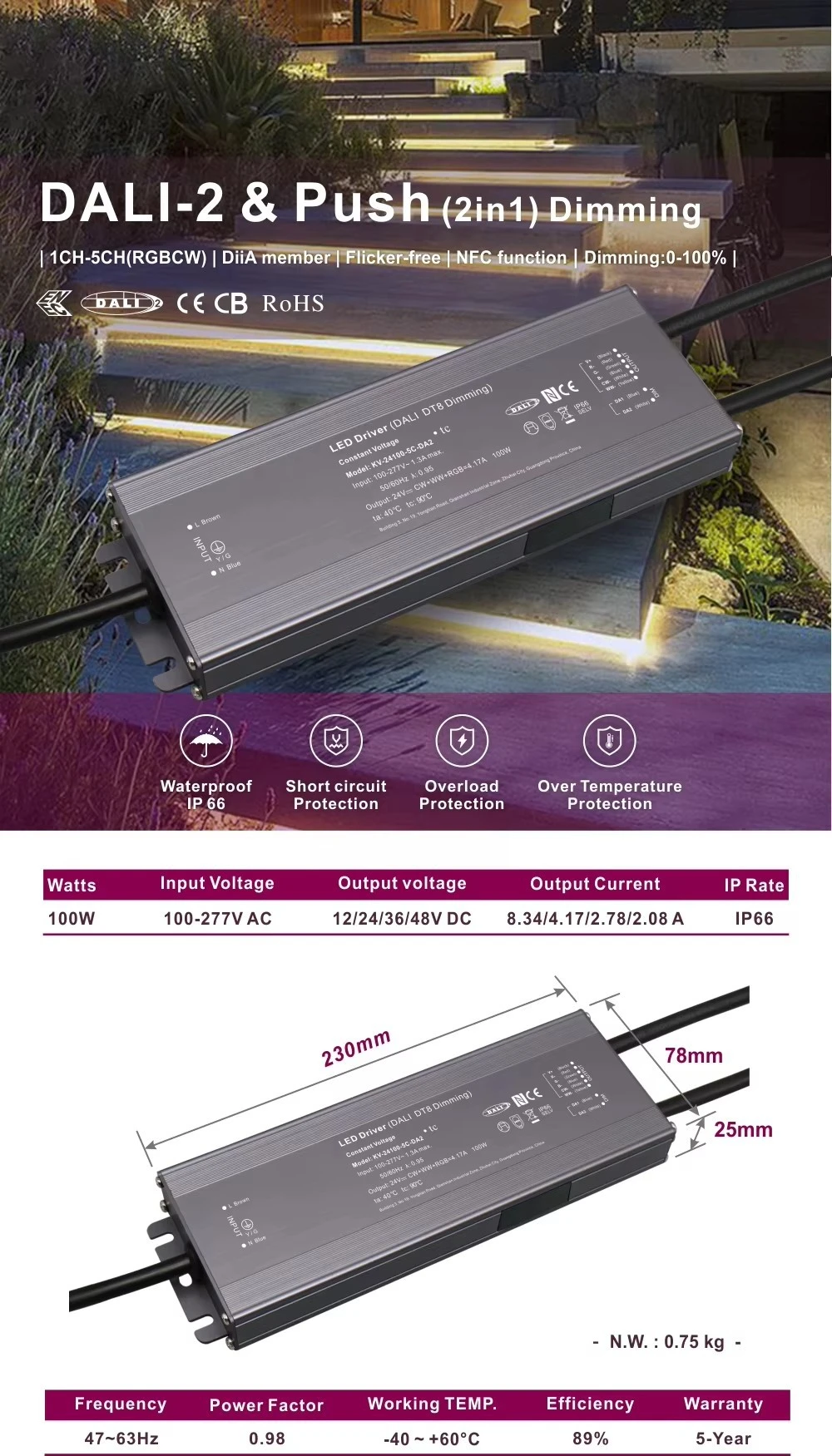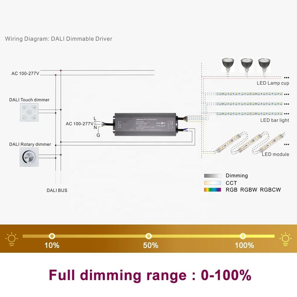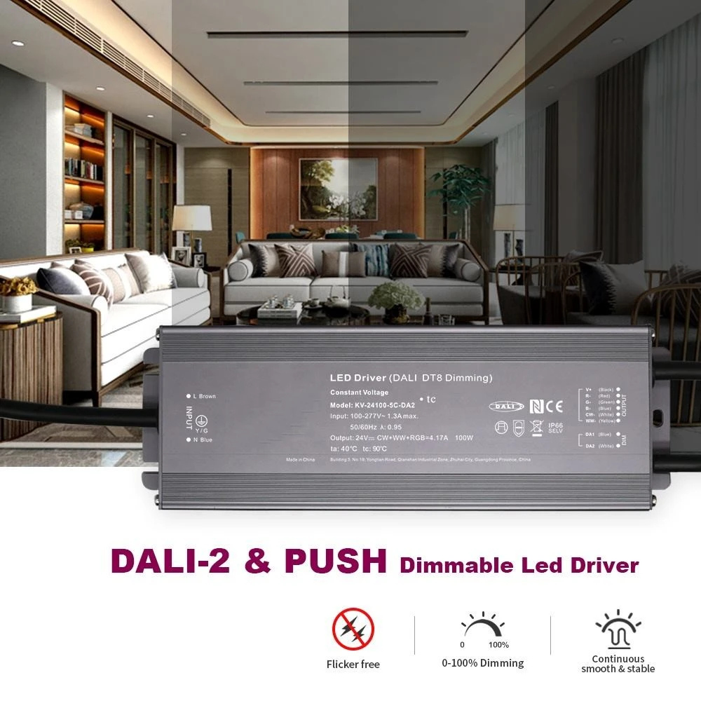 Starwell, ammattimainen LED-ohjainvalmistaja Kiinassa, tämä 100 W:n DALI-vakiojännite CCT-himmentävä LED-ohjain on DALI-2-sertifioitu, ja se tarjoaa tarkan digitaalisen himmentämisen 0,1 %:sta 100 %:iin saumattomaan valonhallintaan. Se sisältää välttämättömät suojat oikosulkua, ylikuormitusta ja ylilämpöä vastaan sekä passiivisen jäähdytyksen vapaan ilmankierron kautta.