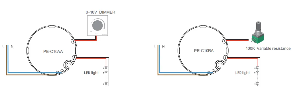 0-10V 1-10V 10vpwm signaaliliitännän virta < 0,1mA (100k potentiometri mallille pe-c10ra) |