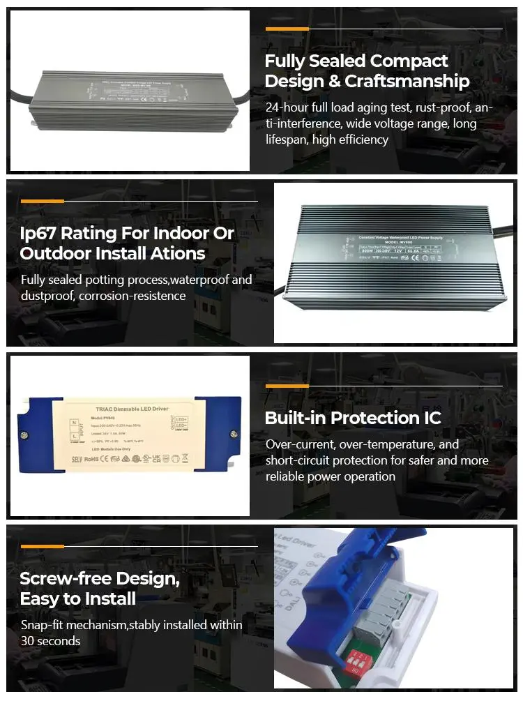 STARWELL korkealaatuinen 1200 mA:n jatkuvan virran vedenpitävä LED-ohjain, joka on erityisesti suunniteltu LED-valaisimiin ulko-/kosteissa ympäristöissä, yhteensopiva 10-40 W katuvalojen, puutarhavalaisimien, vedenalaisten valojen, mainosvalolaatikoiden ja muiden useiden skenaarioiden kanssa. Korkean tarkkuuden vakiovirtasirujen ansiosta lähtövirran virhe on ≤ ± 3 %, tarkasti ja vakaasti 1200 mA:ssa, mikä eliminoi pohjimmiltaan välkyntä (välkkyn syvyys <5 %) ja valon heikkenemisongelmat, mikä voi pidentää LED-valaisimien käyttöikää yli 30 %; IP67 vedenpitävällä tiivistystekniikalla + vedenpitävällä kastelutekniikalla varustettu vedenpitävä taso ei vuoda 30 minuuttiin 1 metrin syvyydessä, kestää ankaria ympäristöjä, kuten sadetta, roiskeita ja pölyä, ja sen jatkuva käyttöikä ulkona on yli 50 000 tuntia, mikä tekee siitä luotettavamman pitkäaikaiseen käyttöön.