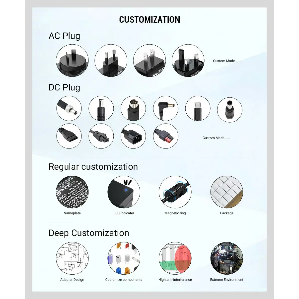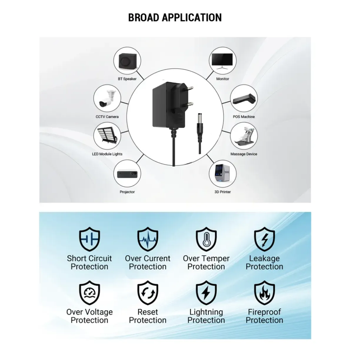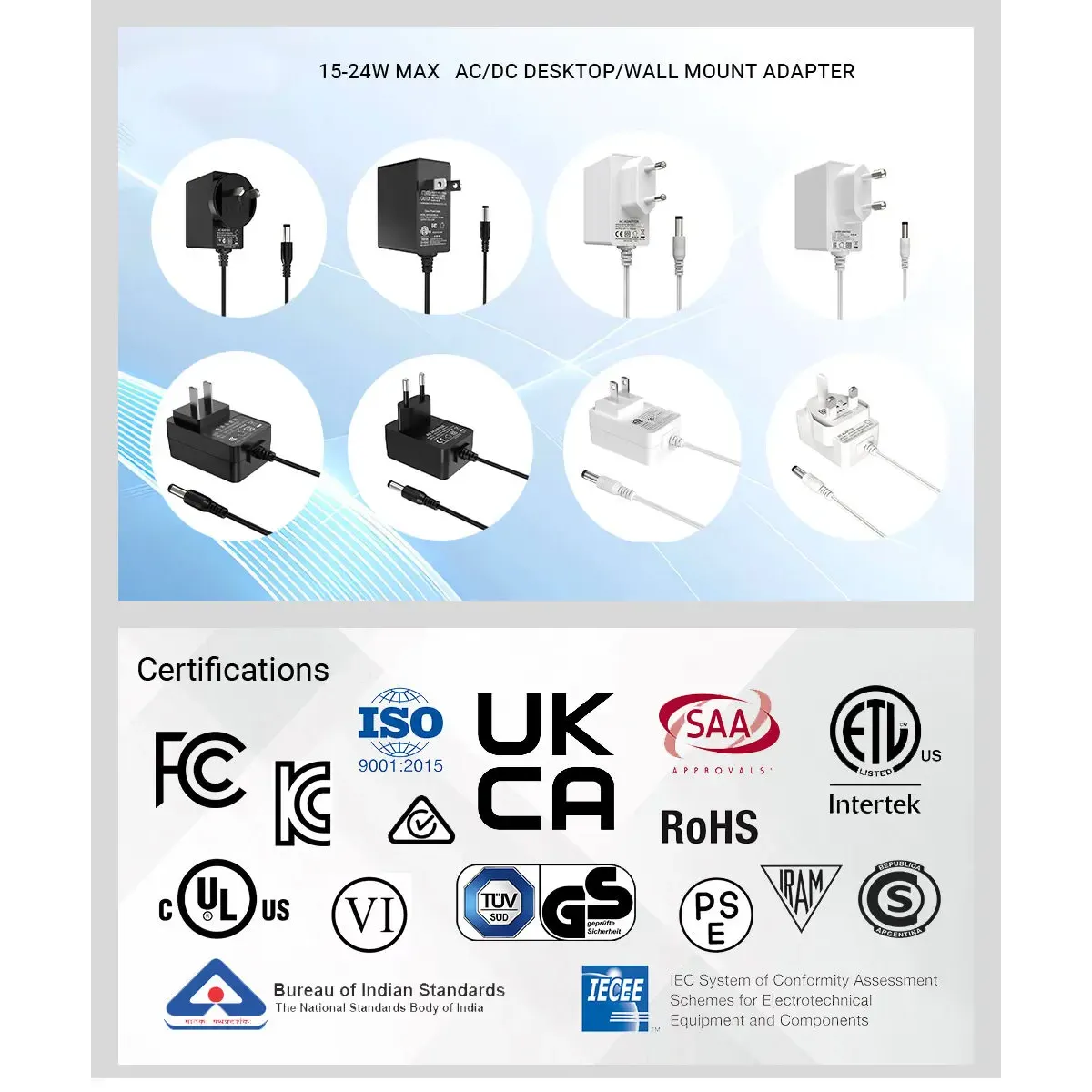 24 W virtalähdesarja täyttää tiukat kansainväliset standardit, ja sillä on maailmanlaajuiset sertifikaatit, mukaan lukien CE/FCC/UL/RCM/SAA/UKCE/KC/BIS/PSE-sertifikaatti, mikä takaa turvallisuuden ja ympäristön vaatimustenmukaisuuden. Sen eurooppalainen pistokerakenne mahdollistaa turvalliset liitännät, mikä tekee siitä helpon käytön erilaisissa asetuksissa.