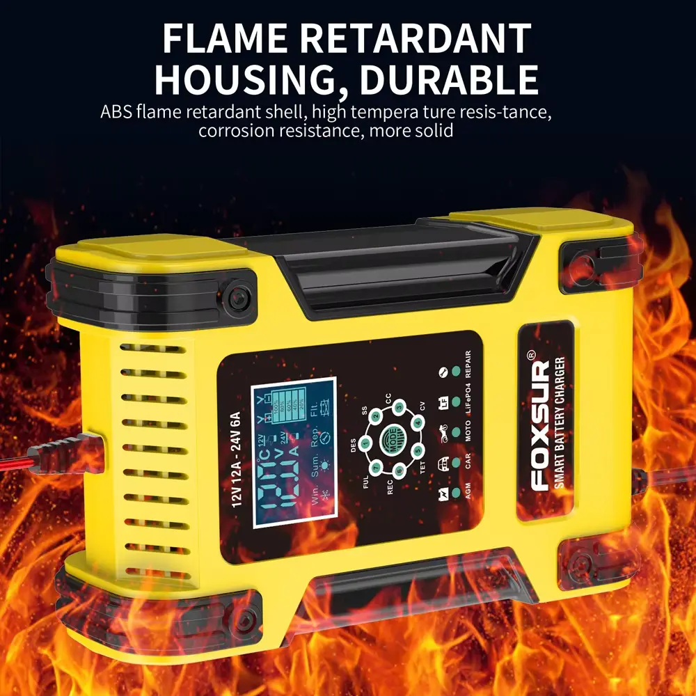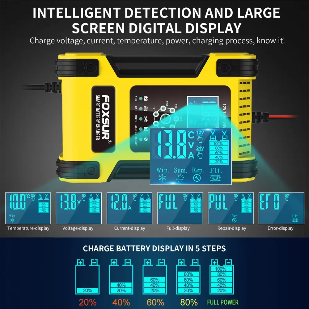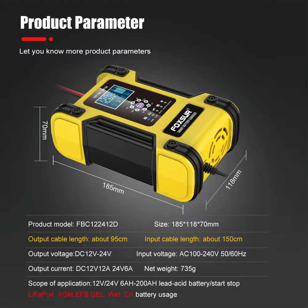 Toisin kuin muut markkinoilla olevat laturit, 12 V 24 V 12 A 7-segmenttinen älykäs lyijyakkulaturi tarjoaa kattavat turvaominaisuudet, jotka suojaavat sekä akkuasi että itse laturia.