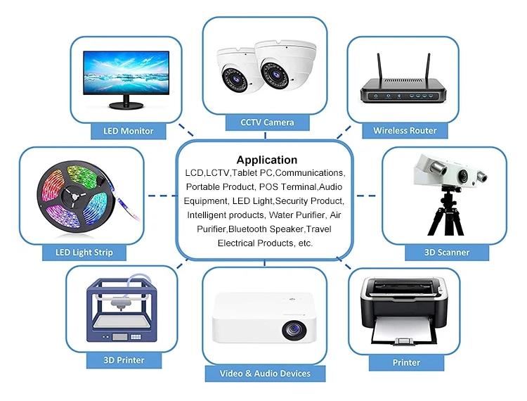 Vahva laiteyhteensopivuus - 12V 5A standardi vaihdettava virtalähde, 5,5×2,1mm kansainvälisen standardin tasavirtaliitäntä, yhteensopiva yli 90 % reitittimistä, valvontalaitteista, LED-valonauhoista ja muista laitteista. Tätä yhtä laitetta voidaan käyttää useisiin tarkoituksiin, mikä ratkaisee käyttämättömien sovittimien liiallisen kertymisen kotona.