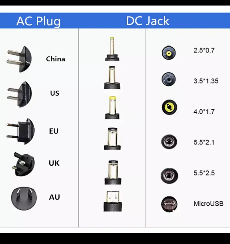 Liittimen tyyppi: Tavallinen DC-tynnyriliitin (yleisiä kokoja ovat 5,5 mm × 2,1 mm tai 5,5 mm × 2,5 mm, muokattavissa laitevaatimusten mukaan).