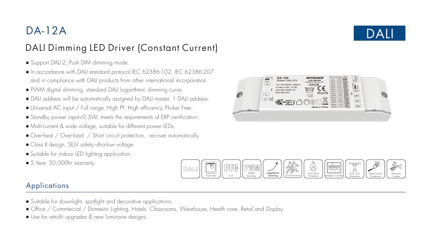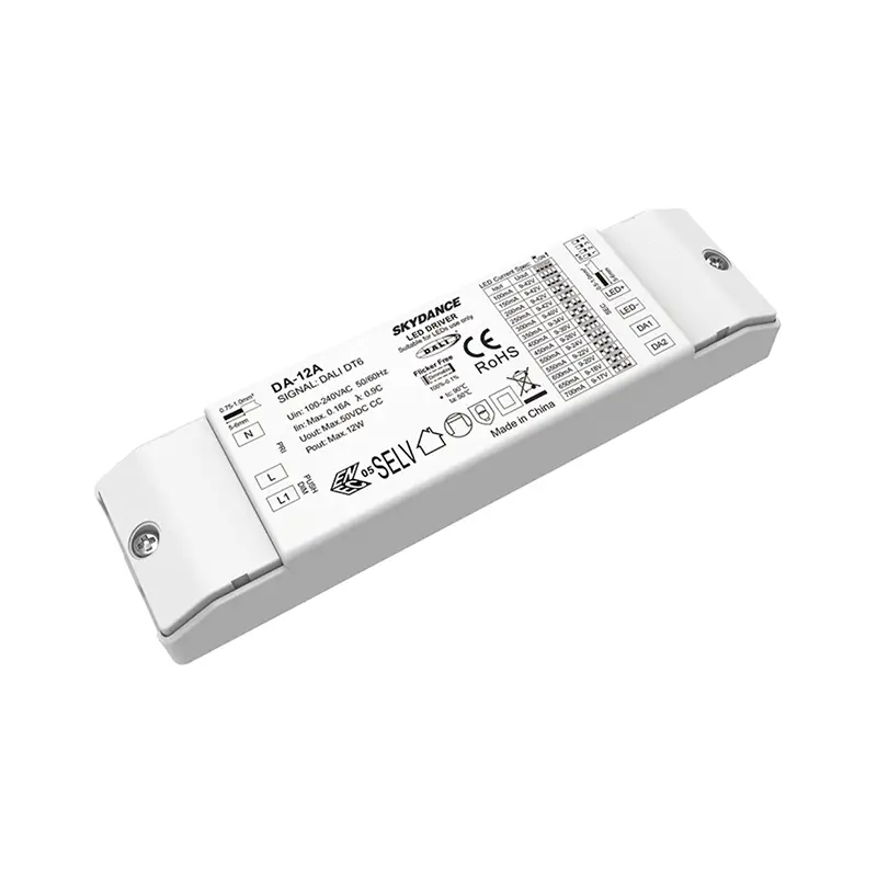 STARWELL-tehtaan korkealaatuinen 12 W:n vakiovirta DALI-himmennettävä LED-ohjain on älykkäiden valaistusjärjestelmien korkean suorituskyvyn ydin, joka on yhteensopiva maailmanlaajuisten DALI-protokollien ja 100-240 V AC laajan tulon kanssa. DALI-himmennettävä LED-ohjain tuottaa vakaan vakiovirran ulostulon (100-900 mA säädettävä) ±5 % tarkkuudella, mikä varmistaa tasaisen kirkkauden kaikissa valaisimissa. T-PWM-himmennysteknologian ansiosta se saavuttaa 0,0001–100 % erittäin syvän himmennyksen ilman välkkymistä ja täyttää IEEE 1789 -standardit silmien mukavuuden takaamiseksi. Sen PF>0,95 ja jopa 87 %:n hyötysuhde vähentää energiahukkaa, kun taas IP20-suojaus ja -20-50 ℃ käyttölämpötila-alue sopivat asuin-, liike- ja teollisuuskäyttöön.