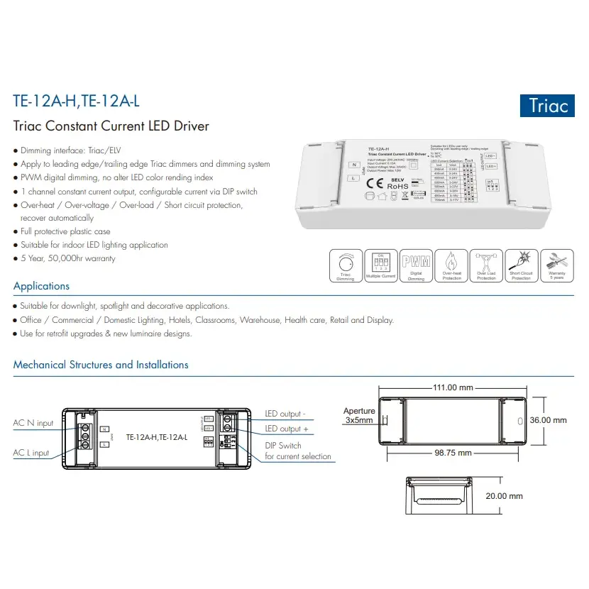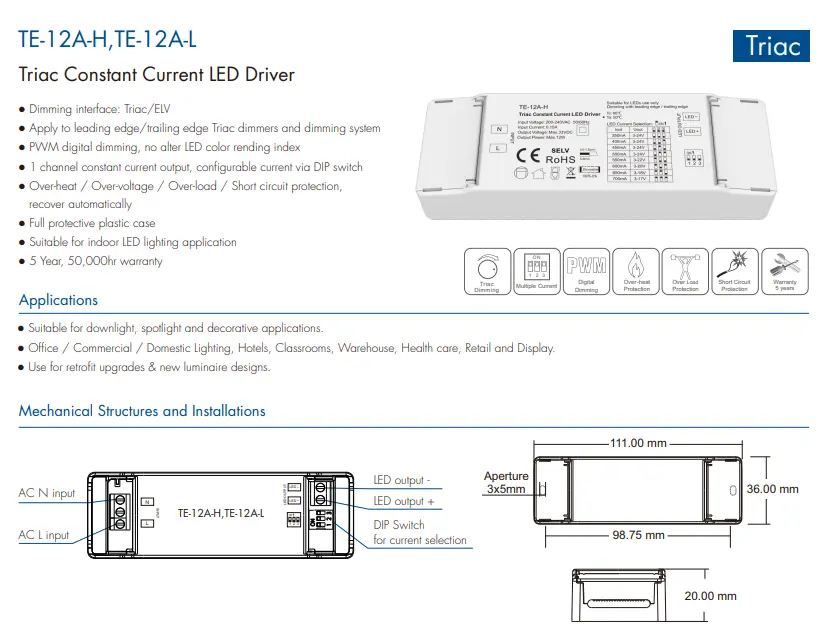 Starwellin korkealaatuinen 12 W:n vakiovirtatriac-himmentävä led-ohjain integroi ylijännite-, ylivirta- ja oikosulkusuojaustoiminnot, ja siinä on korkea tehokerroin ja alhainen harmoninen särö, mikä täyttää useat kansainväliset energiatehokkuus- ja turvallisuusstandardit. Sen kompakti muotoilu tekee siitä helpon asennuksen ja sopii erilaisiin sisävalaistusskenaarioihin, kuten alasvaloihin, kohdevaloihin ja koristevaloihin, mikä tekee siitä ihanteellisen ohjainratkaisun energiaa säästäviin saneerauksiin ja älykkäisiin valaistussovelluksiin. TuoteOminaisuudet: