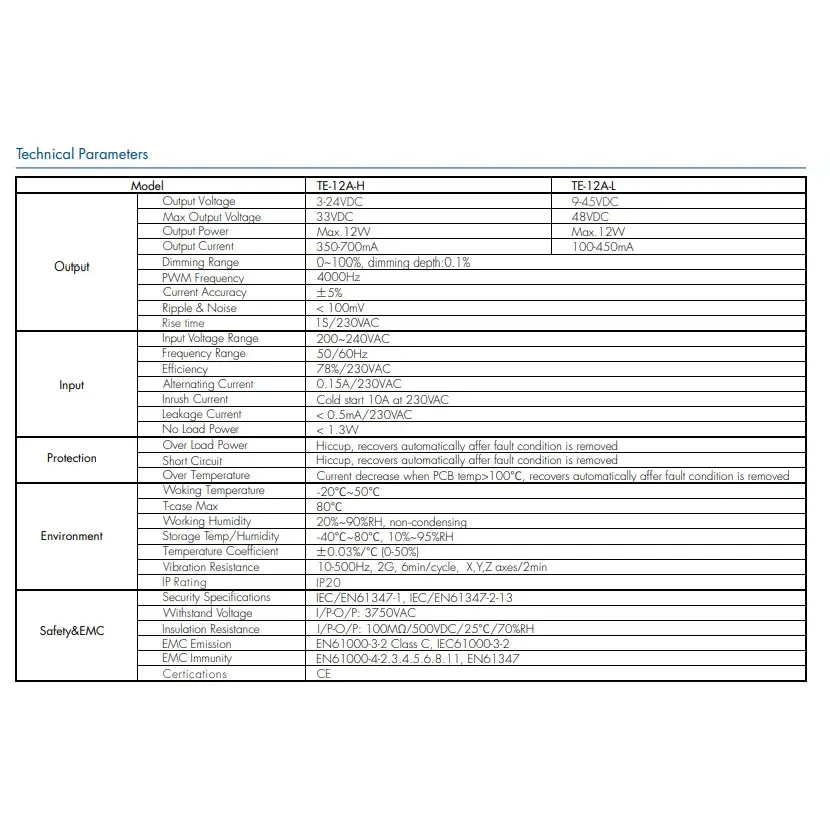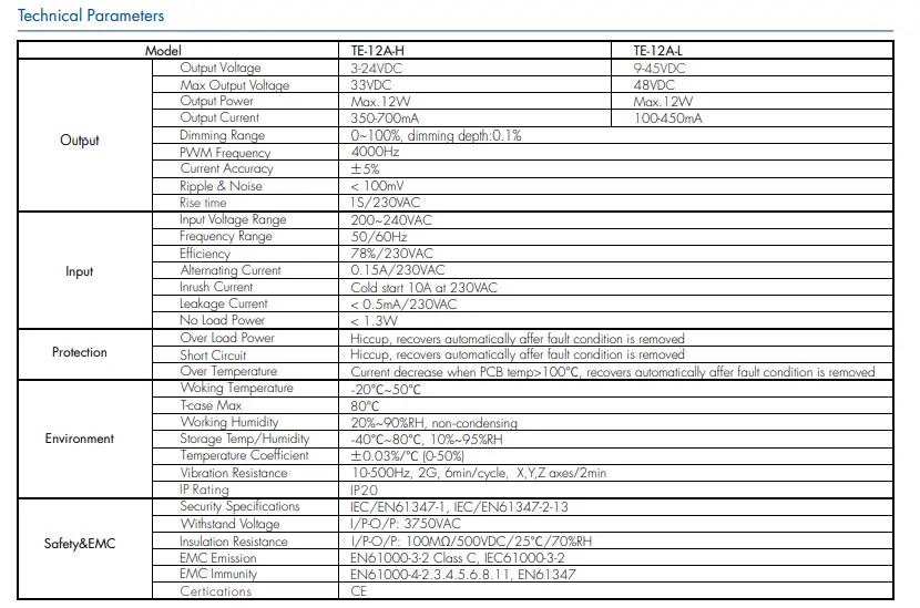 Tulojännite: 200-240VAC 50-60Hz Tulovirta: 0,15A Lähtöteho: 12 wattia max Lähtöjännite: 9-42V Takuu: 2 vuotta Sertifikaatti: CE/Rohs