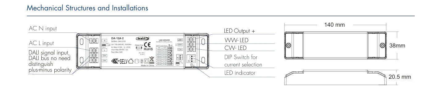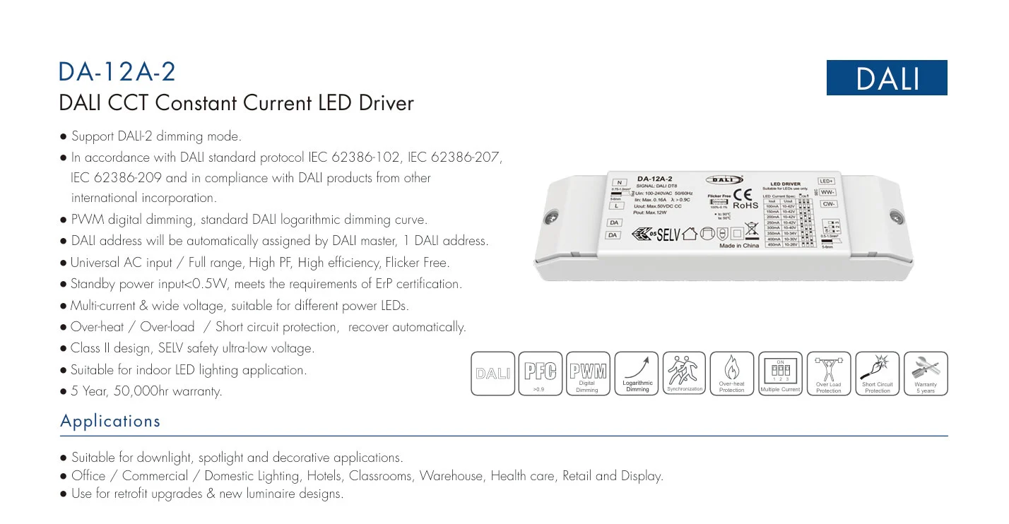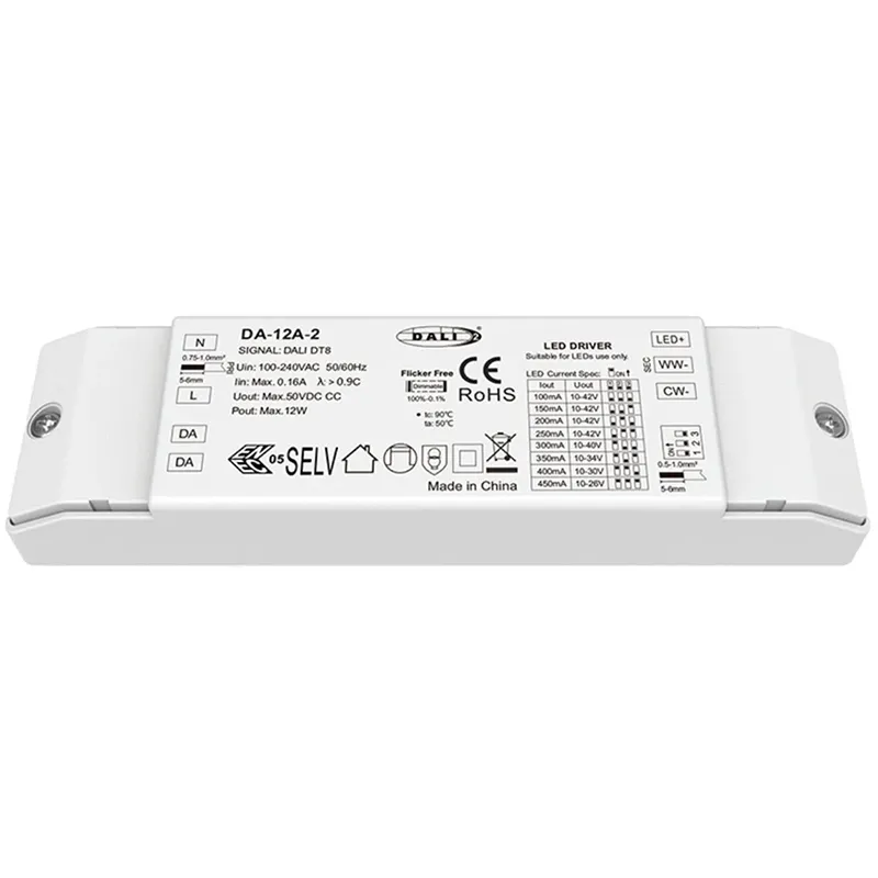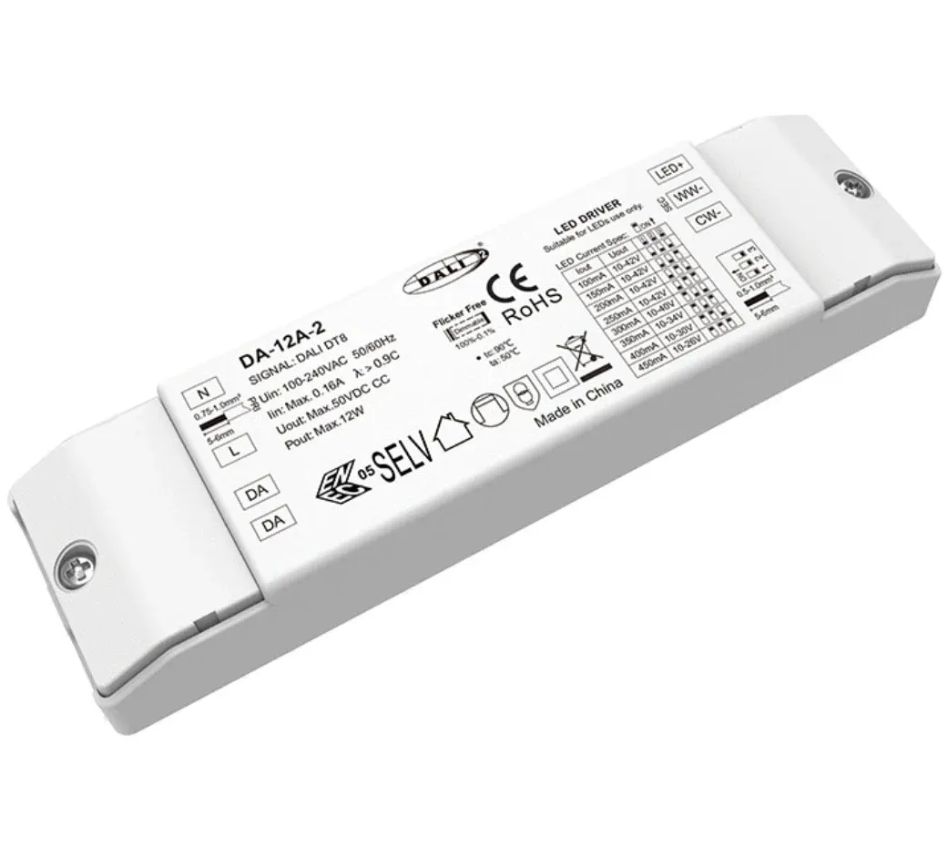 Tässä vakiovirtaisessa DALI CCT -himmennettävässä LED-ohjaimessa on kehittynyt kaksois-DALI-liitäntä ja se tukee standardoitua DALI-2 DT8 -protokollaa. Se mahdollistaa tasaisen 10–100 % himmennyksen, mutta myös itsenäisen lineaarisen värilämpötilan säädön (CCT) välillä 2700K - 6500K. Yhdistetyn DALI-järjestelmän avulla käyttäjät voivat ohjelmoida dynaamisia valaistuskohtauksia – viileästä päivänvalosta tarkennusta lämpimään valkoiseen rentoutumiseen – mikä tarjoaa äärimmäistä joustavuutta ja älykästä valaistuksen ohjausta huippuluokan kaupallisiin ja asuinsovelluksiin.