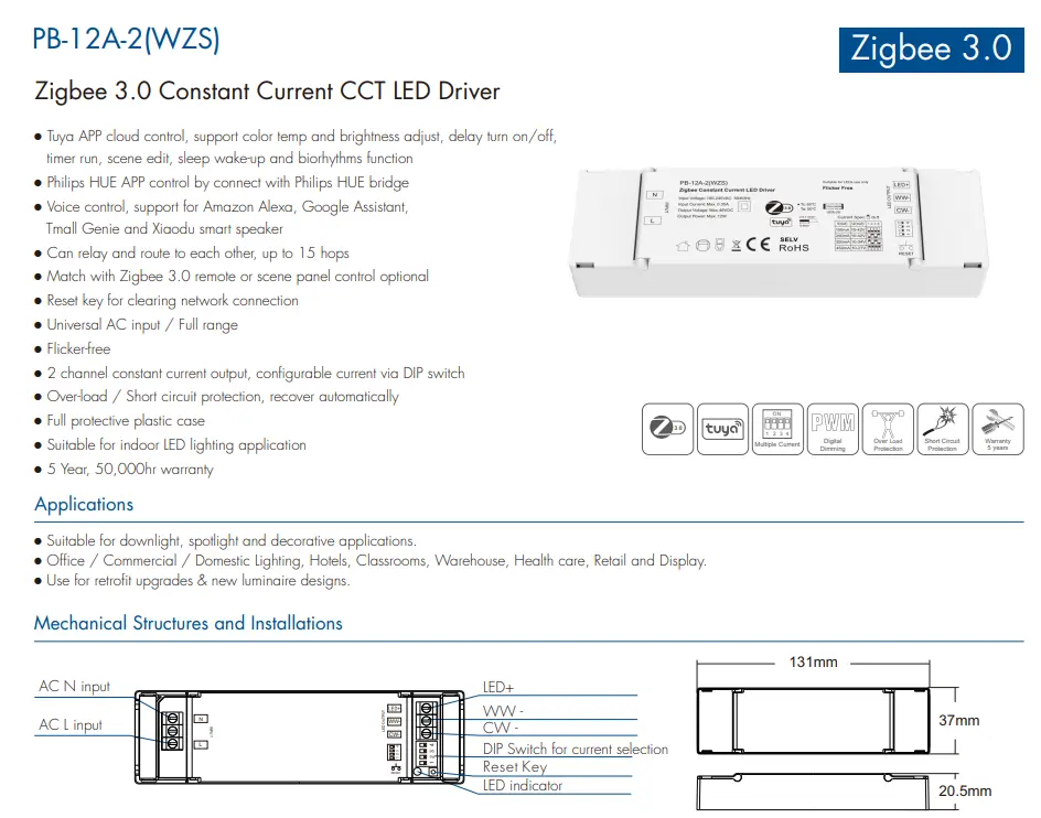 Max.12W LED-kuormitukselle suunniteltu Zigbee 3.0 LED Driver tarjoaa täydelliset suojaustoiminnot. Vakaa lähtö ja luotettava langaton tiedonsiirto tekevät siitä ihanteellisen erilaisiin älykkäisiin sisävalaistusprojekteihin, joissa on pitkäaikainen vakaus.