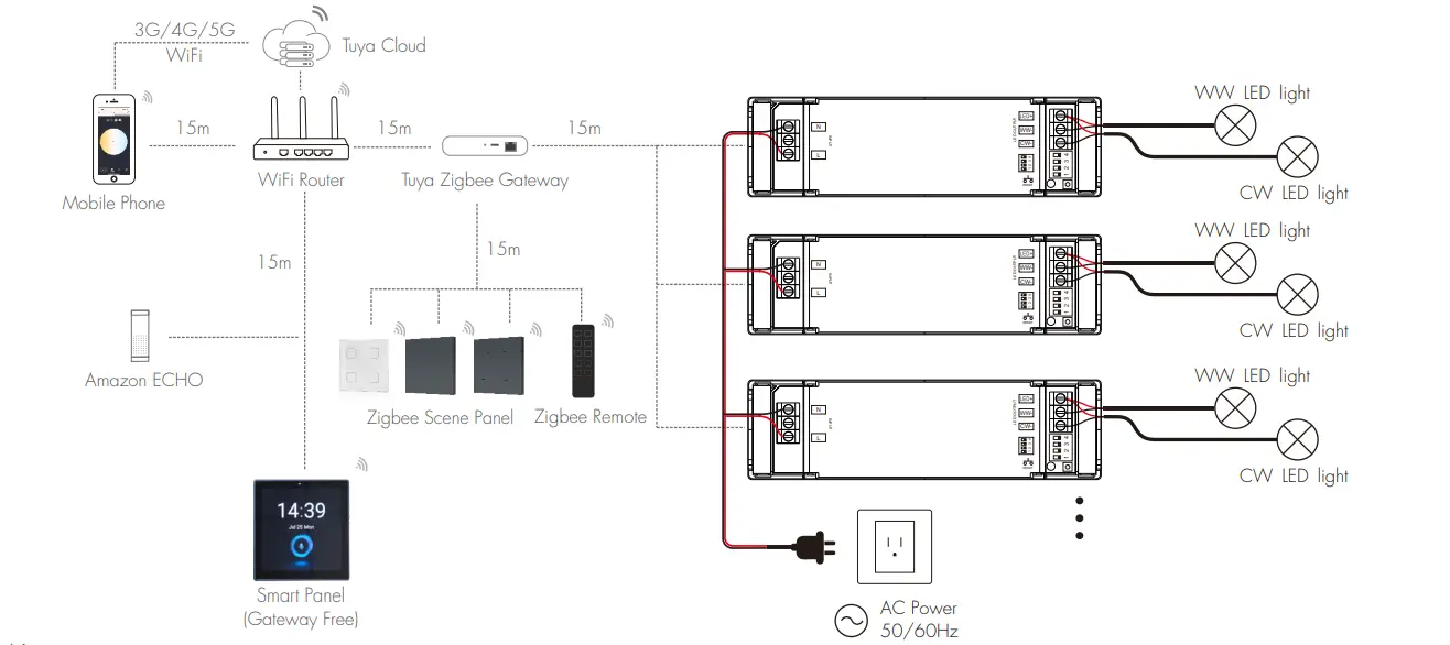 TUYA Zigbee LED -ohjain tukee täysin TUYA Zigbee -protokollaa vakaan langattoman yhteyden aikaansaamiseksi, mikä takaa sujuvan välkkymättömän CCT:n ja kirkkauden himmennyksen. Se tukee APP-ohjausta, ääniohjausta, ryhmäohjausta ja kohtaustilaa, mikä tuo älykkäisiin valaistusjärjestelmiin suurta mukavuutta.