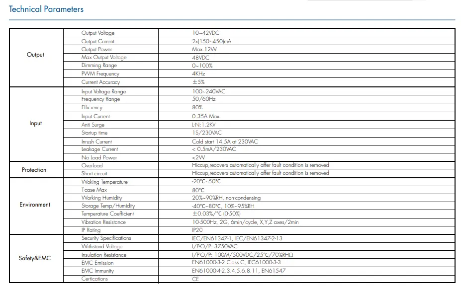 100–240 VAC:n yleistulon ansiosta himmennettävä CCT-LED-ohjain mukautuu maailmanlaajuisiin sähköverkkoihin. Korkea hyötysuhde jopa 85 % ja tehokerroin ≥0,90 pienempi energiankulutus ja lämmöntuotanto, mikä pidentää sekä ohjaimen että LEDin käyttöikää.
