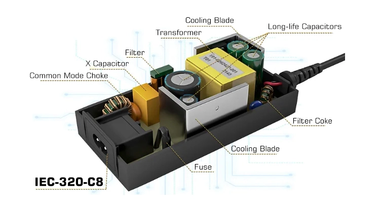 150 W:n sovitin tuottaa jatkuvan 120 W:n tehon ja huippuyhteensopivuuden 150 W:n hetkelliseen virrankulutukseen. Se tukee suuren kuormituksen laitteita, kuten 27-32 tuuman 4K/144 Hz korkean virkistystaajuuden näyttöjä ja pieniä työasemia, ja se kattaa yli 80 % pöytätietokoneiden elektronisista laitteista yhdellä yksiköllä.