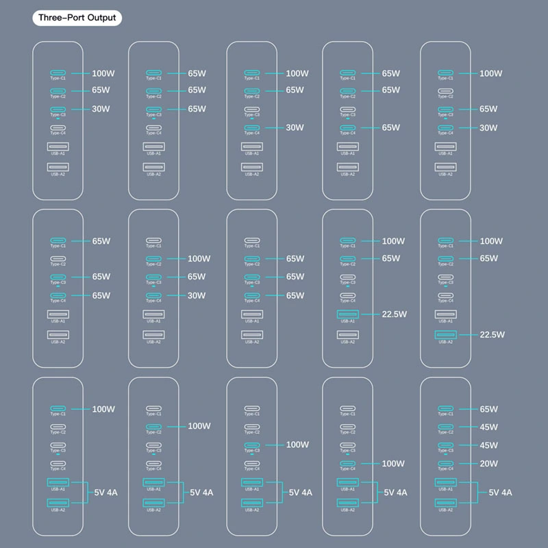 Ulostulo USB C1/C2/C3/C4: 5V/3A 9V/3A 12V/3A 15V/3A 20V/5A (max 100W) USB A1/A2: 5V/3A 9V/2A 12V/1,5A (enintään 18W) |
