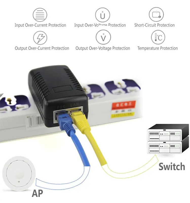 2-porttinen POE-suutin tuottaa vakaan jännitteen ja virran alhaisella aaltoilulla, mikä varmistaa pitkän aikavälin vakaan toiminnan. Laaja syöttöjännite 100–240 VAC mukautuu globaaleihin sähköverkkoihin. Sisäänrakennettu ylijännite-, ylivirta-, oikosulkusuojaus ja ylilämpötilasuoja suojaa sekä kaksiporttista POE-suutinta että liitettyjä laitteita.