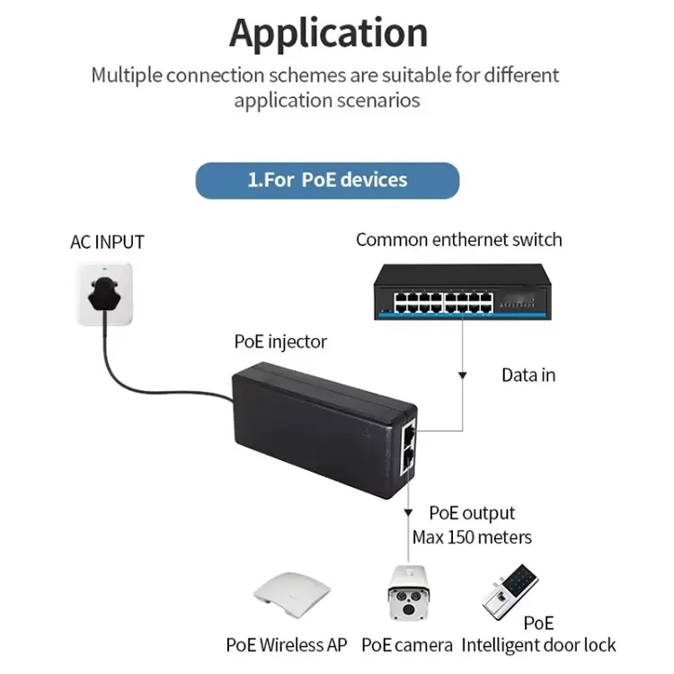 Tämä passiivinen PoE-injektori käyttää suoraa tehonsiirtoa ilman protokollan kättelyä, mikä vähentää järjestelmän monimutkaisuutta ja parantaa yhteensopivuutta tiettyjen verkkolaitteiden kanssa.