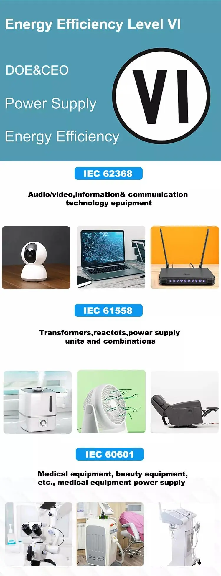 IEC62368 kuluttajaelektroniikkaan, IEC60335 akkulaturiin, IEC60601 lääketieteellisiin laitteisiin, IEC61558 kotikäyttöön, IEC61347 led-valaistukseen. |