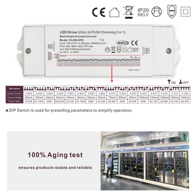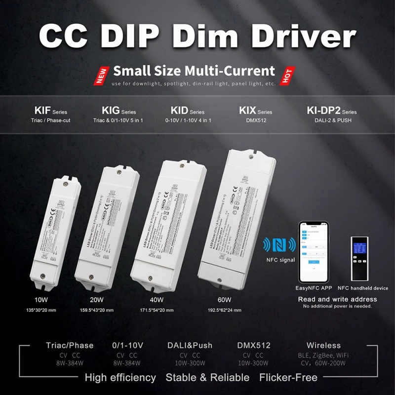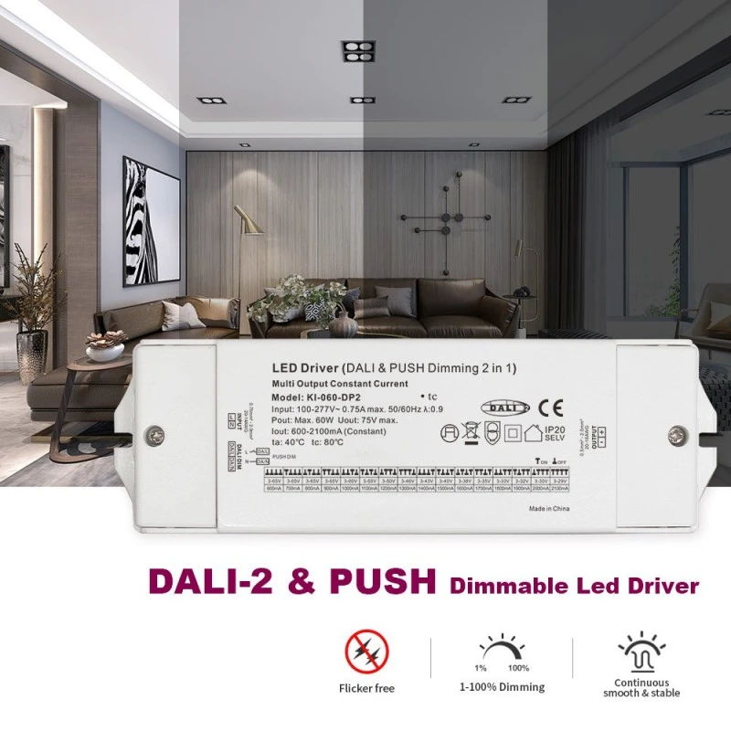 60 W:n vakiovirran DALI-himmentävänä CCT-LED-ohjaimena se käyttää kehittynyttä suljetun silmukan vakiovirran ohjaustekniikkaa varmistaakseen, että lähtövirta (tyypillinen arvo on 700 mA, joka voidaan räätälöidä asiakkaiden LED-moduulivaatimusten mukaan) on erittäin vakaa. Tämä muotoilu välttää tehokkaasti valon vaimenemisen tai väripoikkeaman, joka johtuu LEDien virranvaihteluista, mikä takaa pohjimmiltaan lamppujen pitkän kirkkauden ja käyttöiän. Sen laaja jännitetuloalue ja vakiovirtalähtöominaisuudet tekevät siitä täydellisen yhteensopivan erilaisten LED-alasvalojen, kohdevalojen, paneelivalojen, lineaaristen valojen ja valonauhamoduulien kanssa.