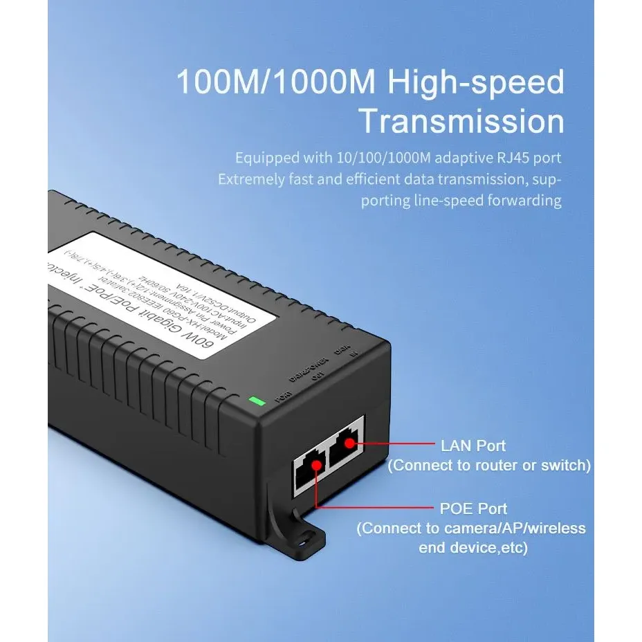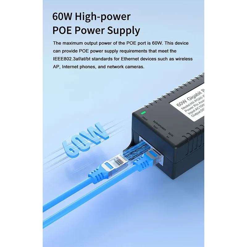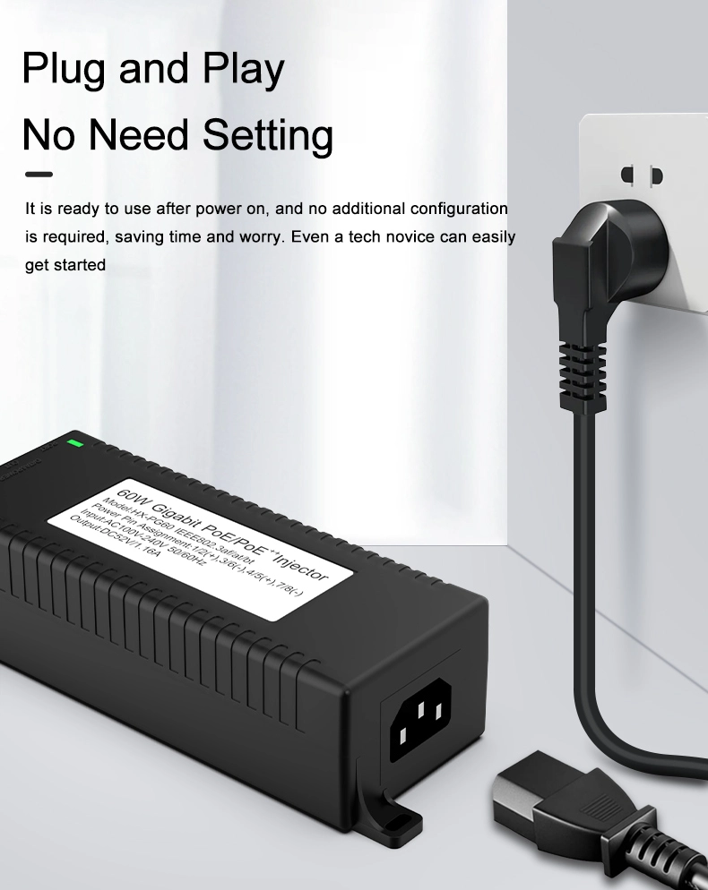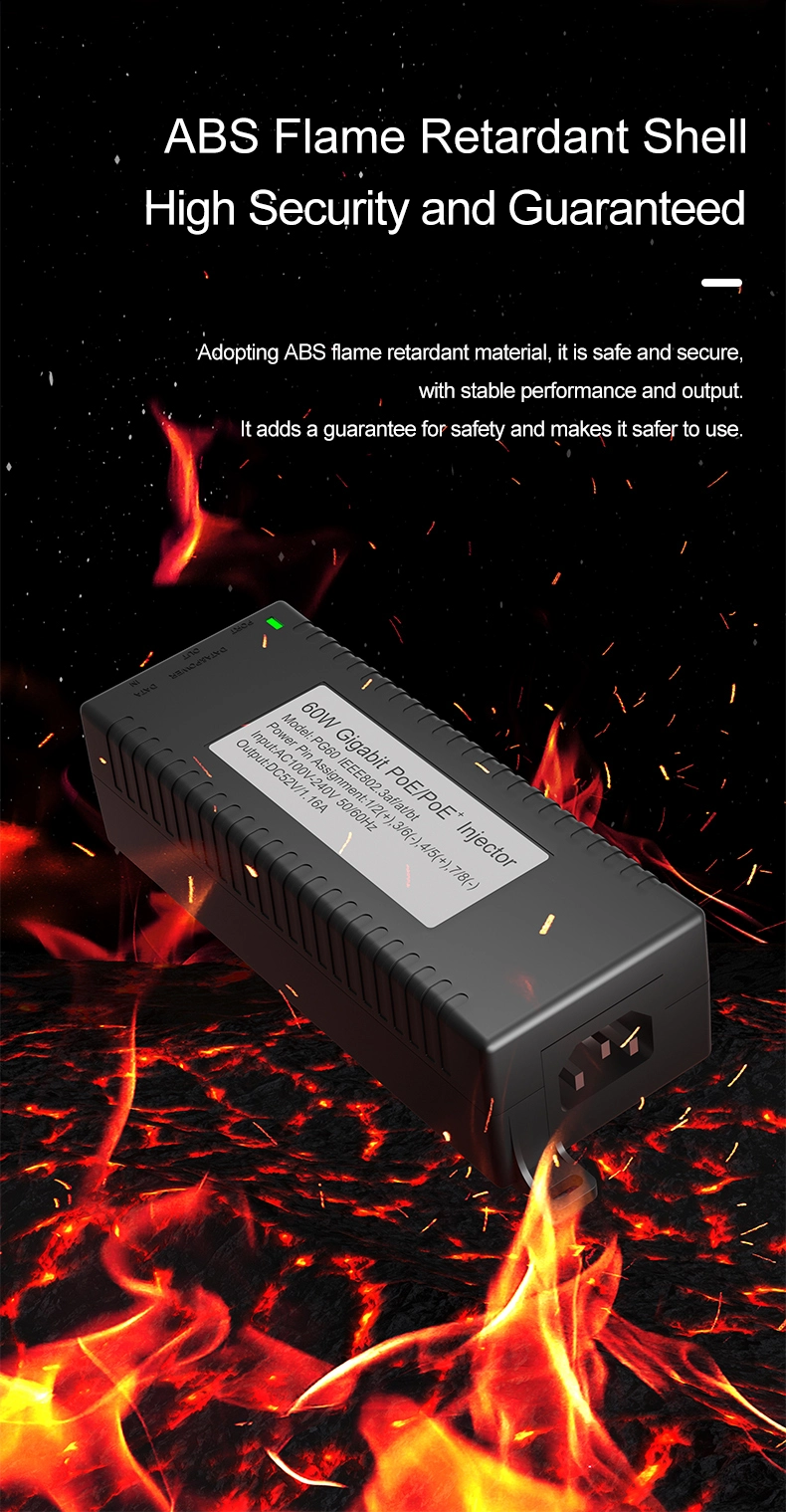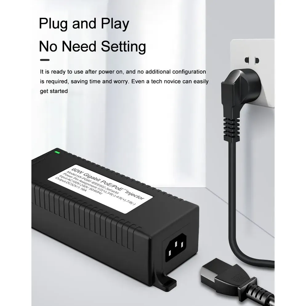 Suojausvalvonta: Gigabitin 60 W:n työpöydän POE-injektori IP-kameran turva- ja verkkolaitteille tarjoaa vakaan virran IP-kameroille ja PTZ-kameroille.