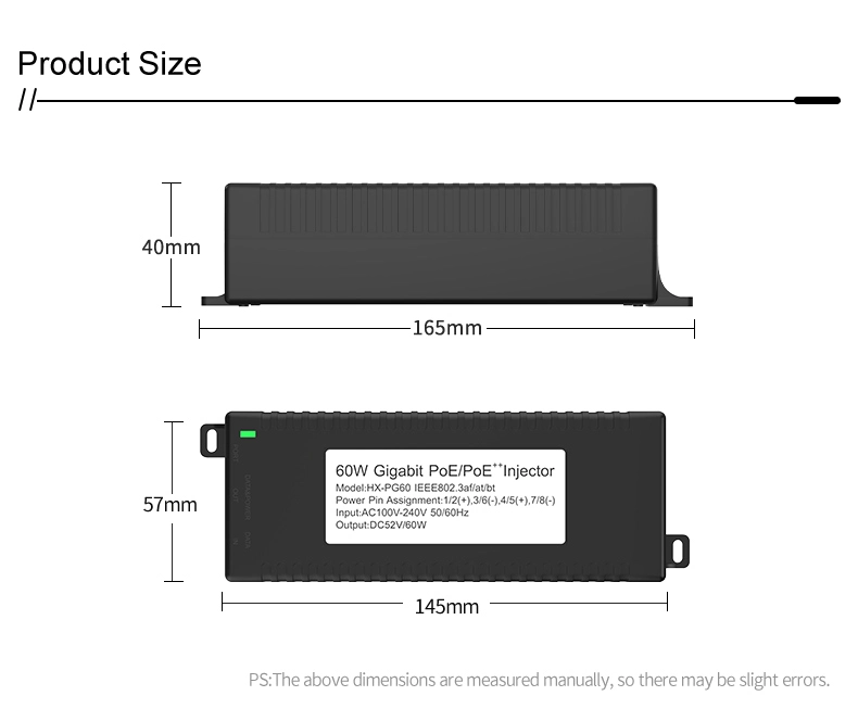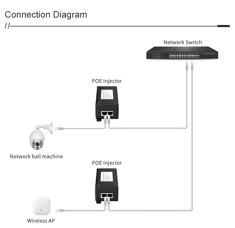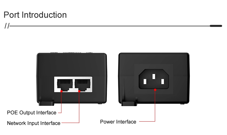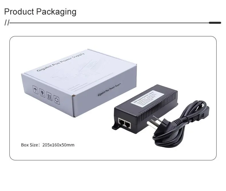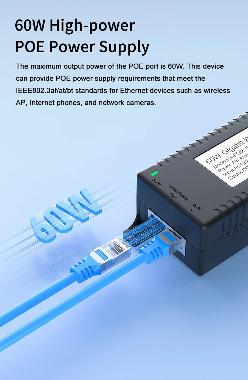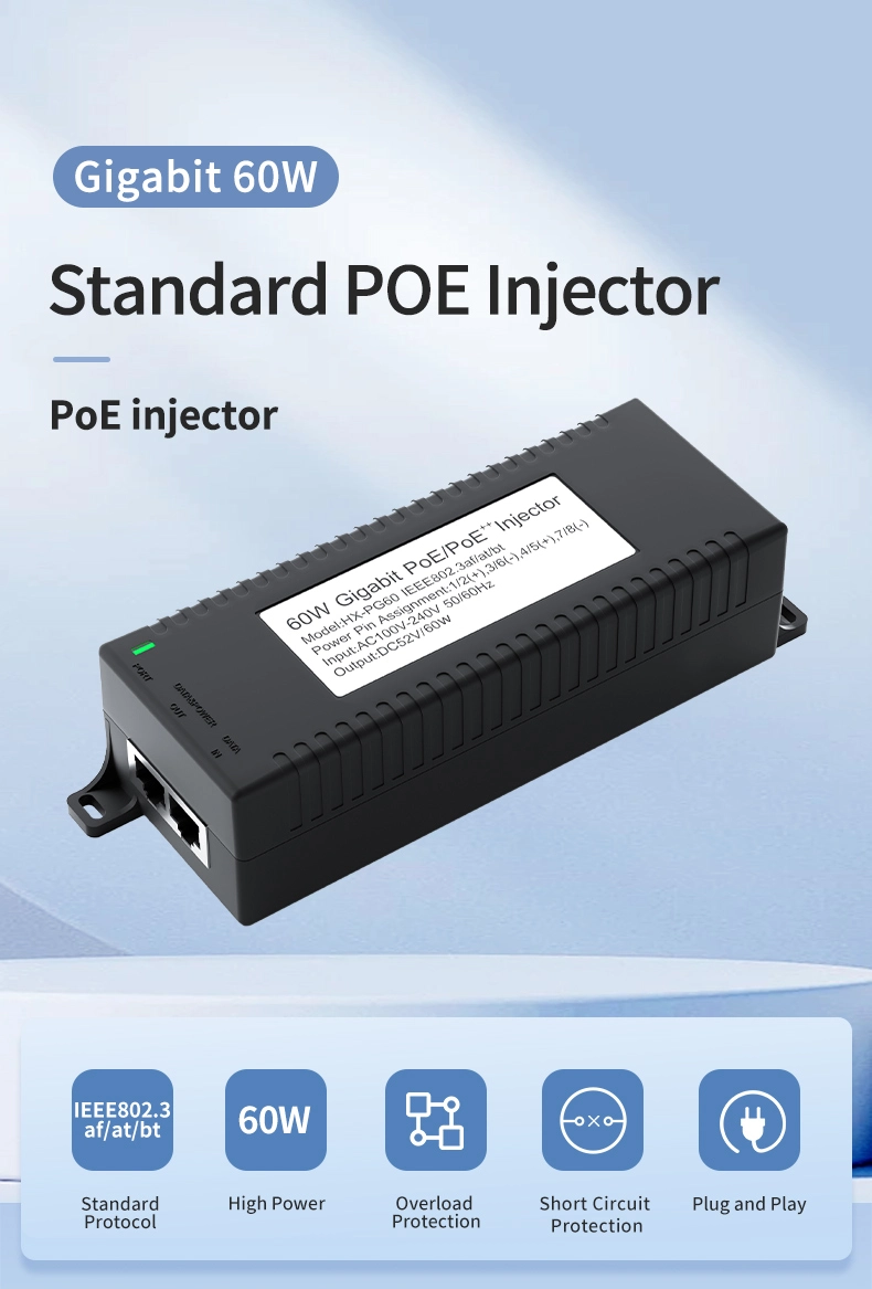 Suojausvalvonta: Gigabitin 60 W:n työpöydän POE-injektori IP-kameran turva- ja verkkolaitteille tarjoaa vakaan virran IP-kameroille ja PTZ-kameroille.