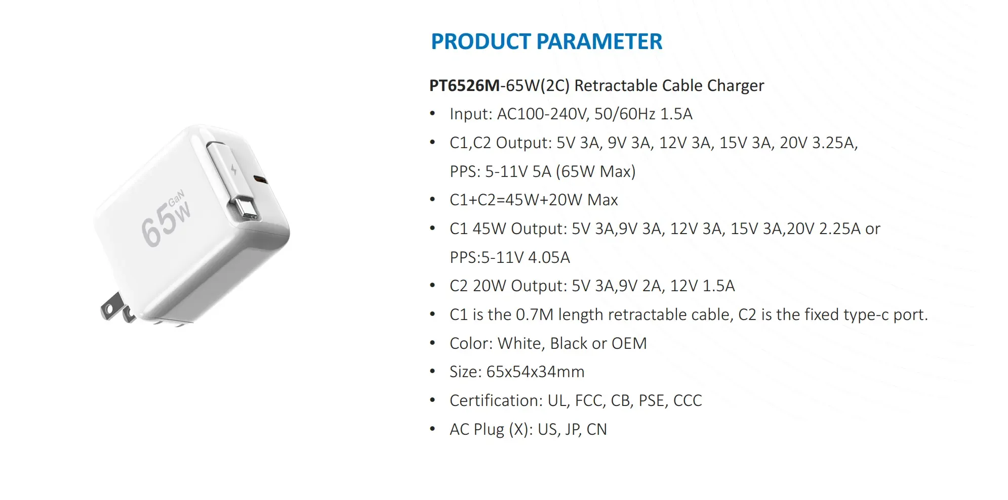 65 W PD-laturi vedettävällä usb-c-kaapelilla Tekniset tiedot: