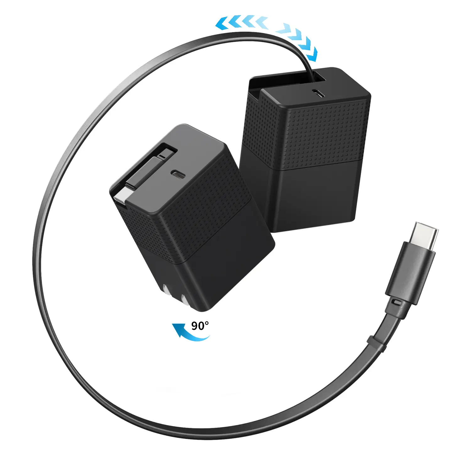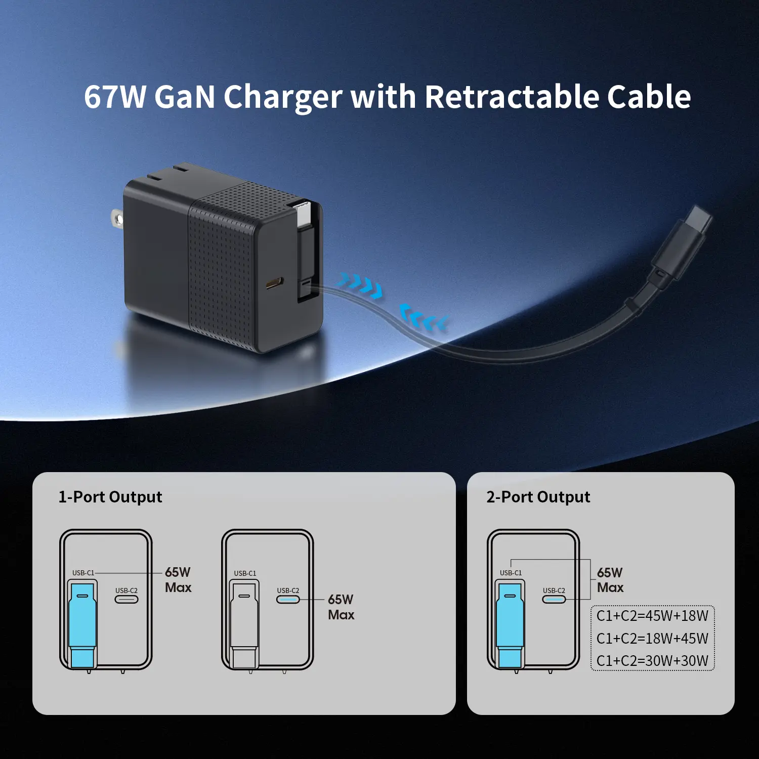 Varustettu sisäänvedettävillä kaapeleilla: 65 W:n pikalataussovitin on varustettu kätevällä ja sotkeutumattomalla 2,3 jalan (1 metrin) pitkällä USB-C-datakaapelilla. Tämä kaapeli voi pidentää ja vetäytyä tasaisesti, mikä välttää sotkeutuneiden johtojen sotkua ja varmistaa, että voit ladata milloin tahansa.