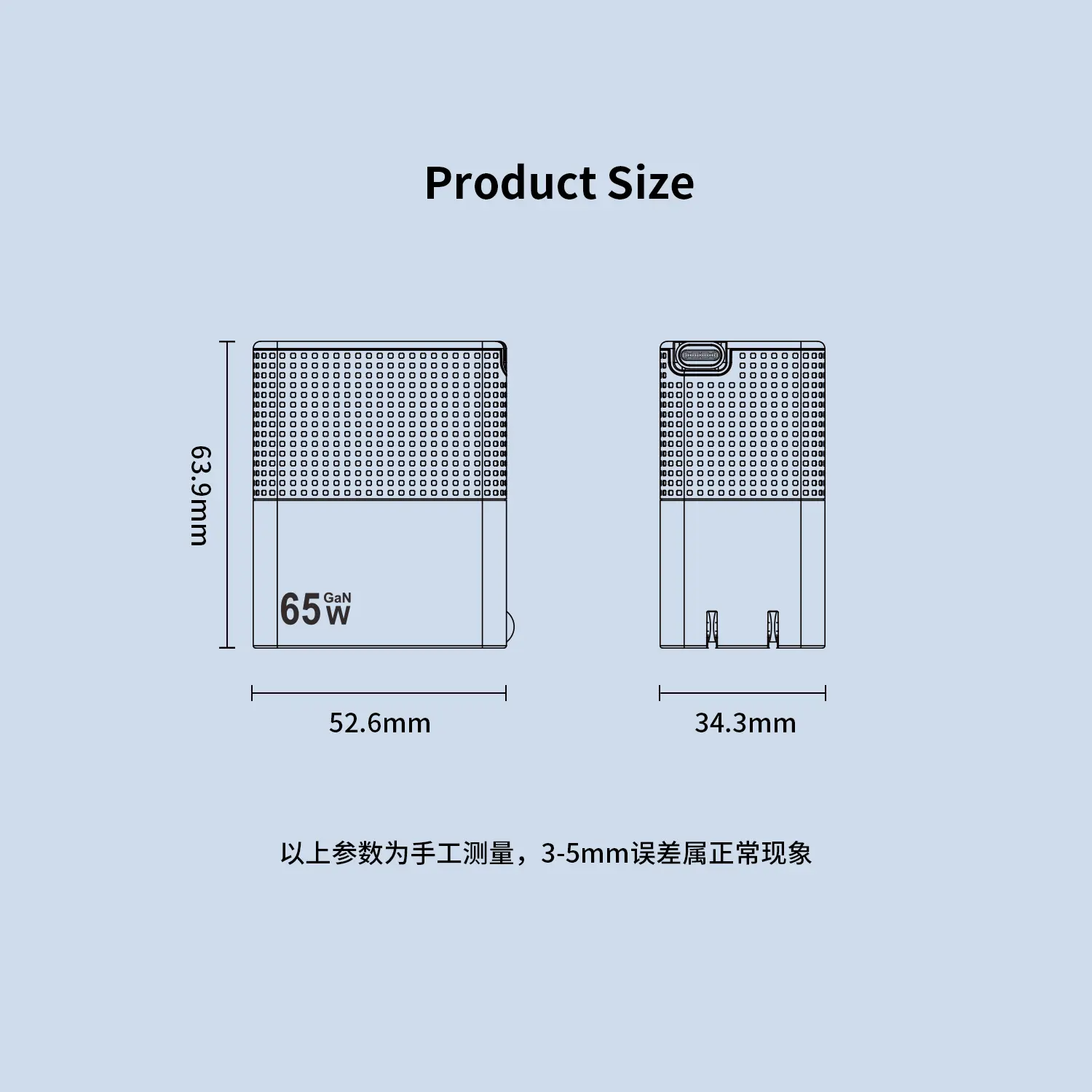 Kaksi USB-C-porttia: 65 W PD 3.0 -laturi voi ladata kahta laitetta samanaikaisesti. Kahden latausprosessin aikana teho on allokoitu 45W ja 20W.