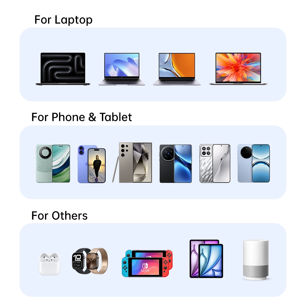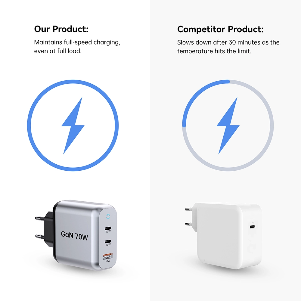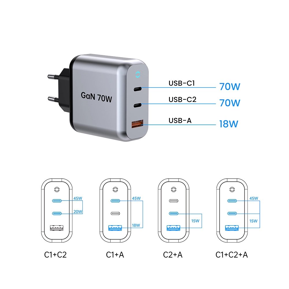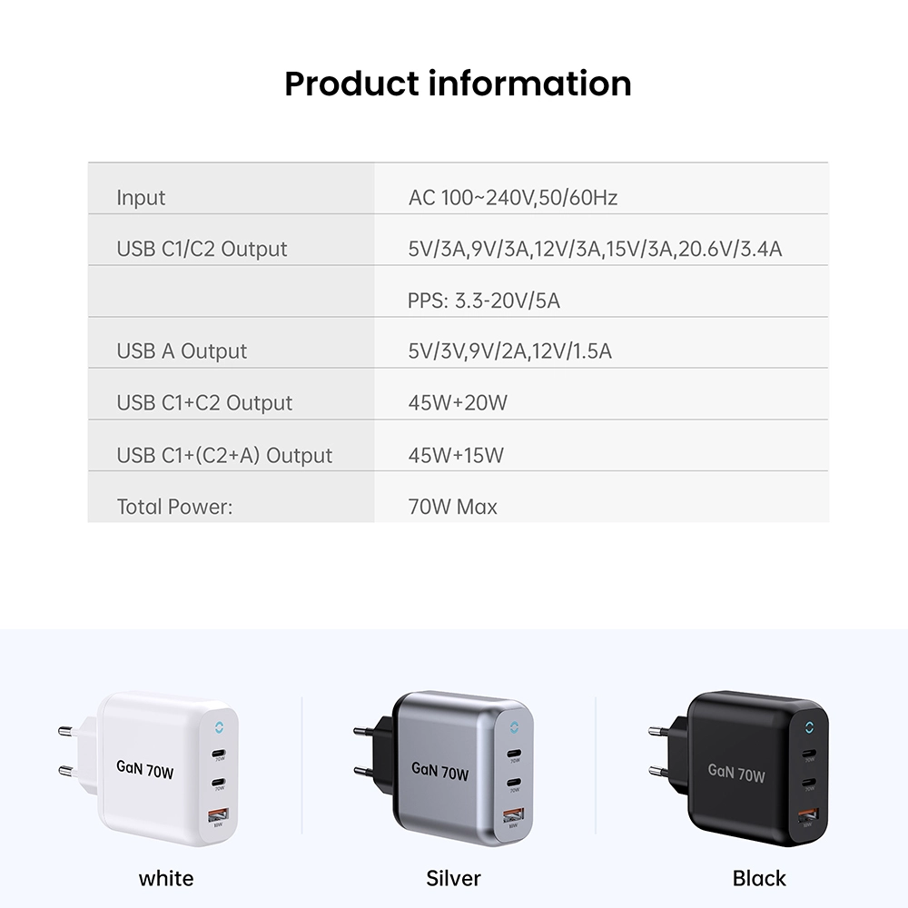 Starwellin kestävä 70 W PD-pikalaturi latpop-tabletille, jota kutsutaan myös 70 W GaN-pikalaturiksi: 2C1A, joka vastaa päivittäiseen matkapuhelinten ja tablet-laitteiden nopeaan lataustarpeeseen. Pieni koko, vahva suorituskyky, edistyneellä galliumnitriditeknologialla. Käytettäessä yhdessä portissa USB-C1-liitännän suurin lähtöteho on 70 W. Kun kahta porttia käytetään yhdessä, USB-C1 säilyttää silti 45 W PD-pikalatauksen. Tukee useita pikalatausprotokollia, mukaan lukien PD3.0, PPS, QC4+ ja QC3.0, mikä varmistaa laajan yhteensopivuuden eri laitteiden kanssa.