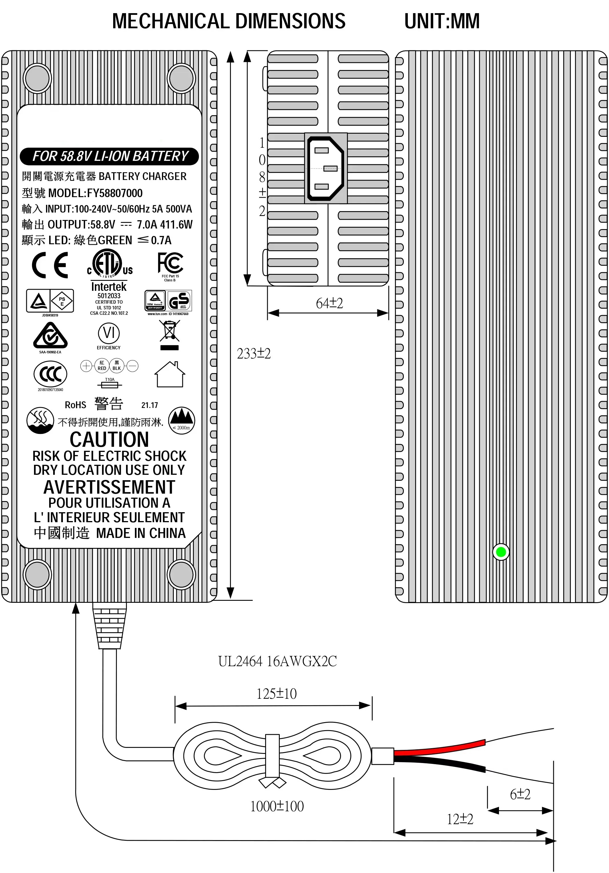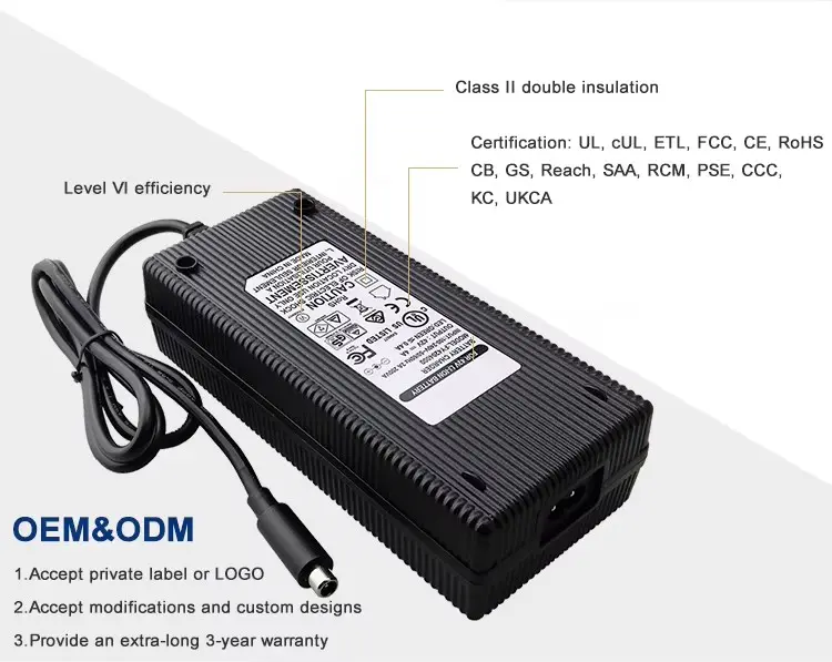 UL-, ETL-, CUL-, GS-, CE-, BS-, SAA-, KC-, PSE-, CB-, FCC-, EMC-, RoHS-, REACH-standardien mukainen laturi tarjoaa tehokkaan, nopean ja turvallisen tehon vaativiin sähkökäyttöisiin sovelluksiin.