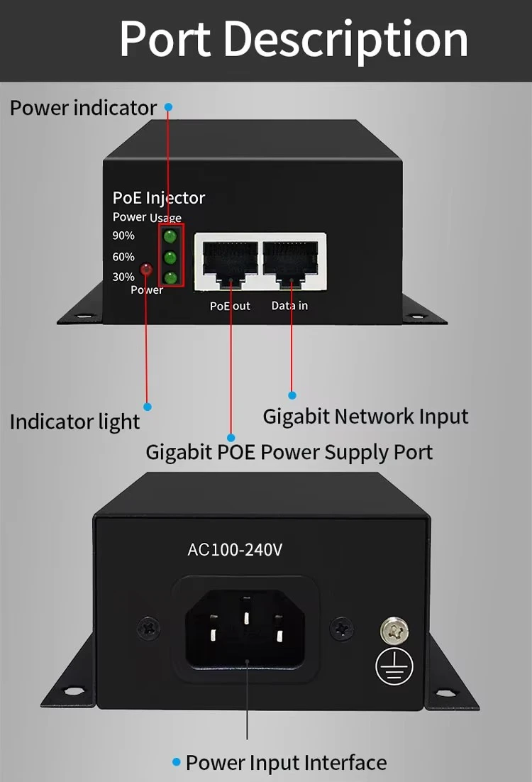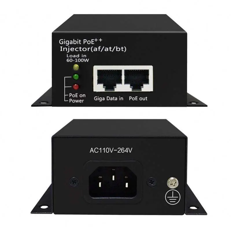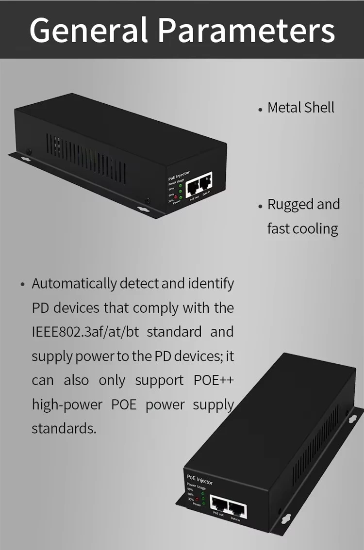 Korkealaatuista Active 60W POE Injectoria tarjoaa kiinalainen valmistaja Starwell. Siinä on yksi 10/100/1000 Mbps tiedontuloportti ja yksi PoE (Data+Power) -lähtöportti. Se tukee täysin vaihtoehtoisia 802.3bt:n napaisuusvaatimuksia hyödyntäen kaikkia neljää paria (1/2+,3/6- & 4/5+,7/8-) samanaikaiseen tiedonsiirtoon ja 48V DC-virtalähteeseen.