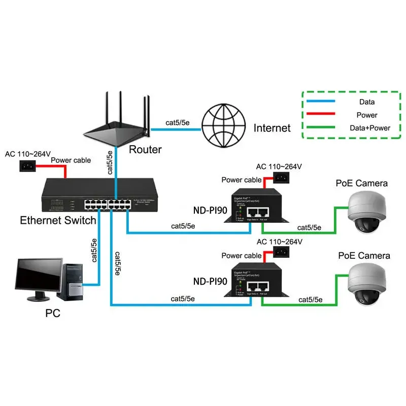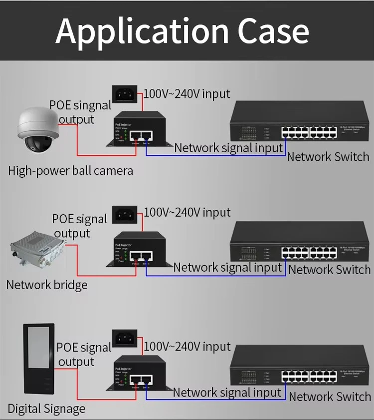 PoE-tuotteet tarjoavat vakio-PoE-, PoE+-, PoE++- ja muut tekniset tiedot vakaan virtalähteen ja tiedonsiirron takaamiseksi langattomalle tukiasemalle, verkkokameralle, IP-puhelimelle ja muille laitteille, yksinkertaistavat johdotusta ja alentavat kustannuksia.