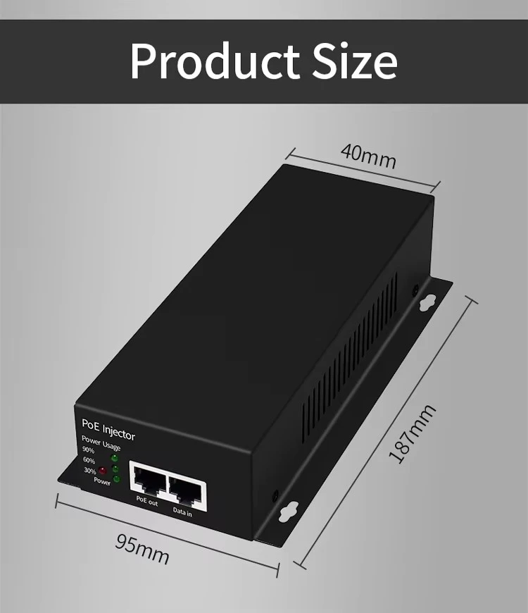 Luotettava teho AC100-240V:n tulojännitealueella ja vakaalla DC48V1.25A-lähdöllä paristokäyttöinen POE-suutin tuottaa puhdasta ja tasaista 48V PoE-virtaa liitettyihin laitteisiin. Se tukee 1/2,4/5(+) ja 3/6,7/8(-) voimalinjan ydinkokoonpanoa, mikä varmistaa laajan yhteensopivuuden erilaisten PoE-käyttöisten laitteiden kanssa vastaanottopäässä.