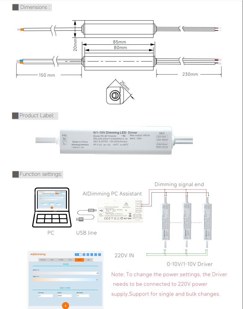 1. Ennen kuin käytät himmennyssignaalia, varmista, että ohjaussignaali on 0–10 V vai 1–10 V, ja signaali- ja virta-asetuksia voidaan muuttaa AIDimming PC:n ja -ohjelmiston kautta. Teholähde parametrien muuttamiseksi on liitettävä 220 V:n virtalähteeseen, jota voidaan muuttaa erissä.
