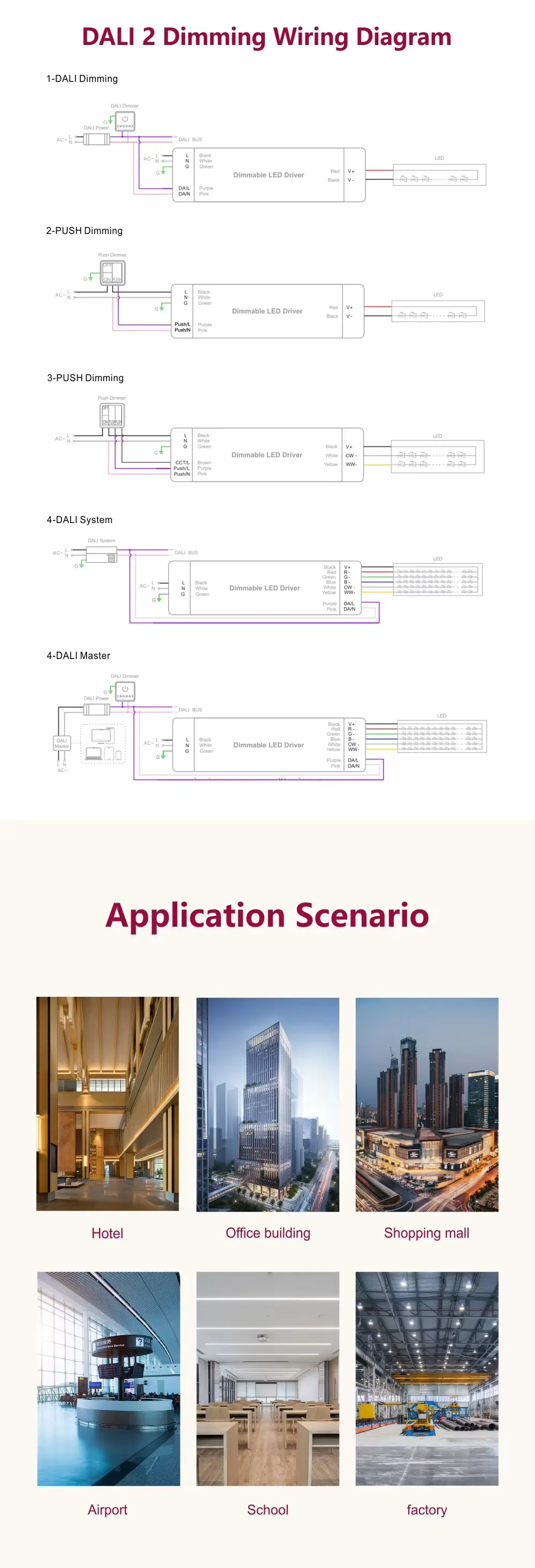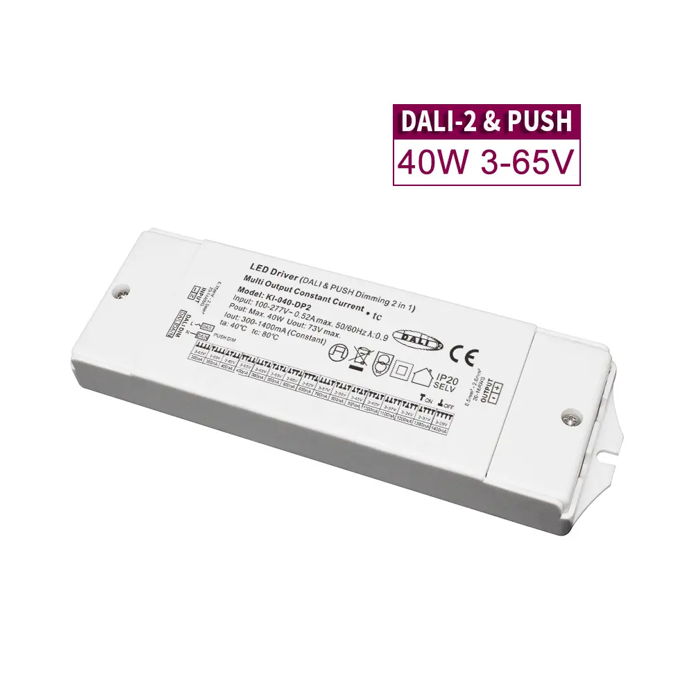 DALI Constant Current CCT Dimming Led Driver soveltuu huippuluokan arkkitehtonisiin, kaupallisiin ja vieraanvaraisiin projekteihin, ja se mahdollistaa valon värilämpötilan ja -voimakkuuden tarkan säädön yhdestä ohjaimesta. DALI-2 DT8 varmistaa tulevaisuuden varman, yhteentoimivan ohjauksen kehittyneille kohtauksille ja energian hallitukselle, kun taas manuaalinen Push Dimming -vaihtoehto yksinkertaistaa asetuksia, joissa erillistä ohjausjärjestelmää ei tarvita.