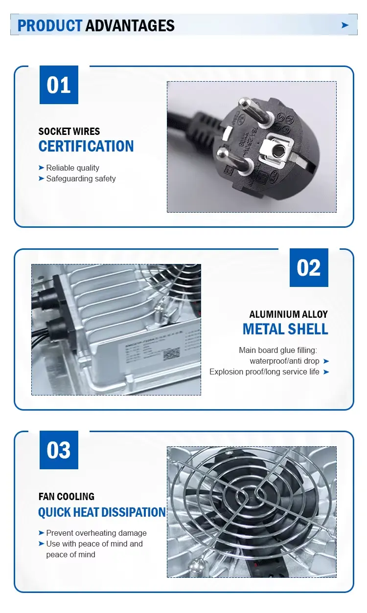 Tehokas ja älykäs suojaus: Tämä laturi saavuttaa jopa 93 % hyötysuhteen ja tehokertoimen ≥0,98, mikä minimoi energiahäviön ja alentaa käyttökustannuksia. Sisäänrakennetut suojaukset sisältävät ylijännite-, oikosulkusuoja-, käänteisen napaisuuden ja ylikuumenemissuojat. LED-merkkivalo näyttää selkeän lataustilan yhdellä silmäyksellä.