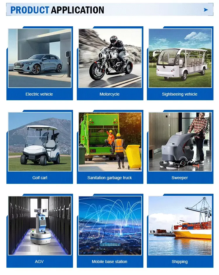 Käyttö: Moottoripyörä / skootteri, kolmipyörä, raitiovaunu, lakaisukone, trukki, kuorma-auto, sähköbussi, lyijyakku, sähköajoneuvo, kiertoajeluajoneuvo, logistiikkaajoneuvo, siivousajoneuvo, partioauto, dyynivaunut, laiva, viestintälaitteet