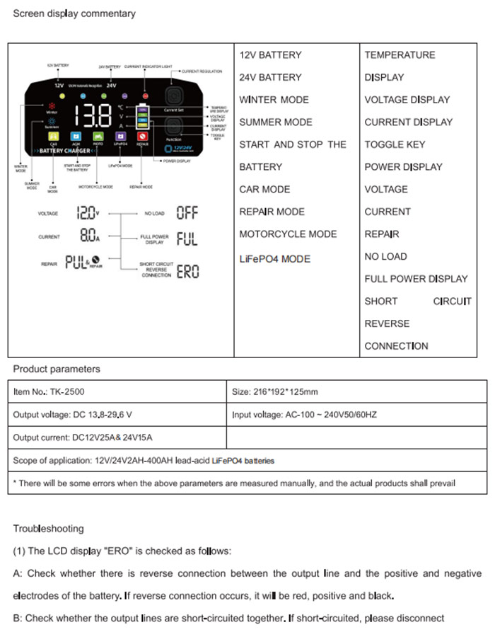 Käyttäjäystävällinen käyttöliittymä: Selkeä, kirkas LED-näyttö näyttää intuitiivisesti lataustilan, akun kunnon ja mahdolliset viat, mikä antaa sinulle täydellisen hallinnan.