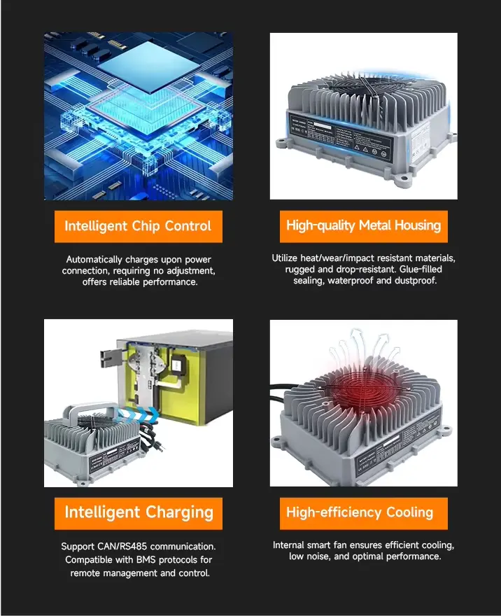 · Integroitu OBC-tiedonsiirtoprotokolla mahdollistaa älykkään latauksenhallinnan ja suojaa akkuja ylilataukselta, ylikuumenemiselta ja oikosululta.