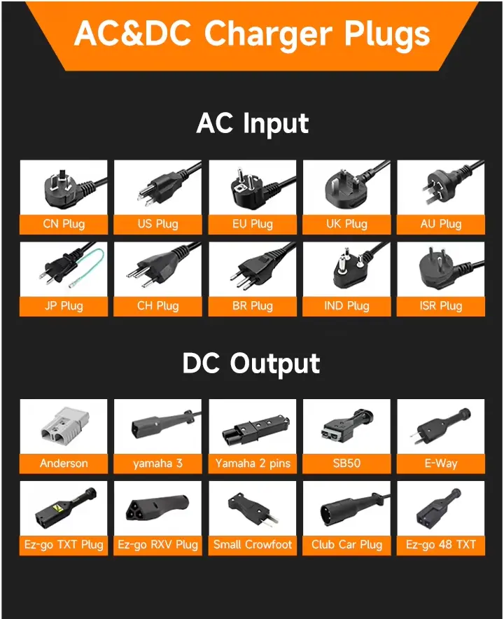 EU-pistoke, yleensä EU-maille, kuten Saksalle, Ranskalle, Alankomaille, Tanskalle, Itävallalle, Ruotsille jne. Iso-Britannian pistoke, yleensä Iso-Britannia, Intia, Pakistan, Singapore jne. AU-pistoke, yleensä Australiaan, Uuteen-Seelantiin, Argentiinaan jne. Yleisiä DC-liittimiä markkinoilla ovat Anderson, EZ-go, DS Club Car ja Yamaha Connector jne.