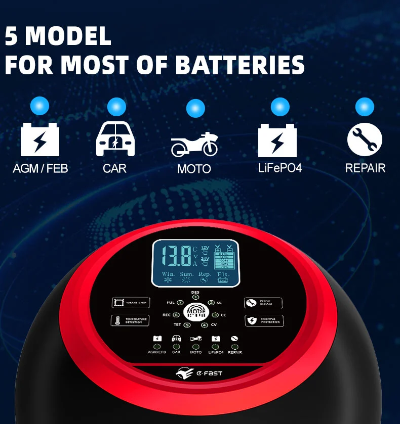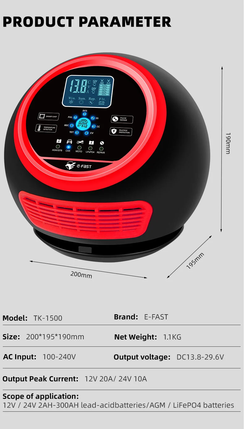 Turvallisuuden kannalta TK-1500 on varustettu useilla suojauksilla, mukaan lukien ylijännite-, ylivirta-, oikosulku-, käänteiskytkentä- ja ylikuumenemissuojat. Se varmistaa pitkän aikavälin vakaan toiminnan tehokkaan lämmönpoistorakenteen ansiosta. Korkean muunnostehokkuuden ansiosta se voi tuottaa 20A 12V-tilassa ja 10A 24V-tilassa, mikä tarjoaa nopean ja energiaa säästävän latauksen. TK-1500 tarjoaa luotettavan, älykkään ja tehokkaan latauskokemuksen, mikä tekee siitä ihanteellisen kumppanin korjaamoille, korjaamoille ja kaluston hallintaan.