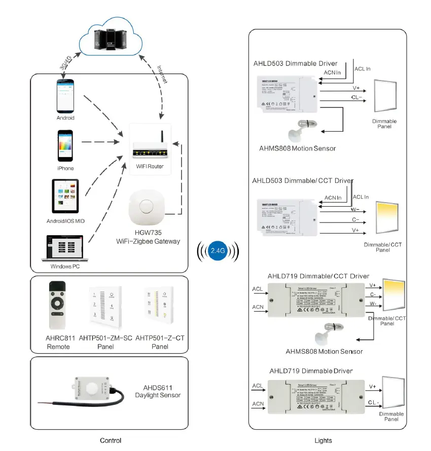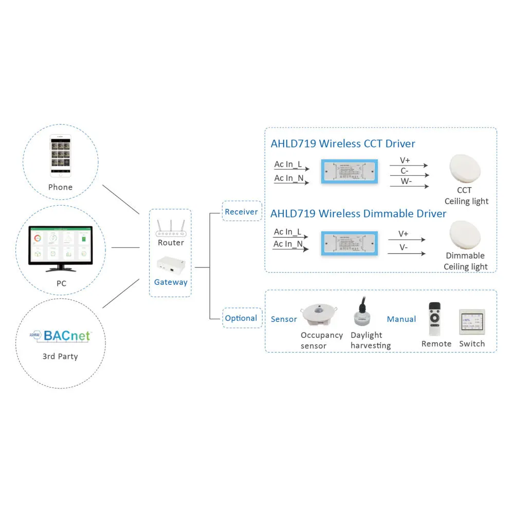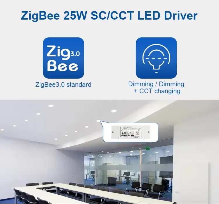 Ohjain toimii Zigbee mesh -verkossa ja muodostaa yhteyden Zigbee-yhdyskäytävään mahdollistaakseen älykkäitä valaistustoimintoja, kuten ajoituksen, kohtauksen ohjauksen, ryhmäohjauksen ja automaation. Tämän tyyppistä LED-ohjainta käytetään yleisesti älykodin valaistusjärjestelmissä, kaupallisissa valaistusasennuksissa ja älykkäissä rakennusten ohjausympäristöissä.