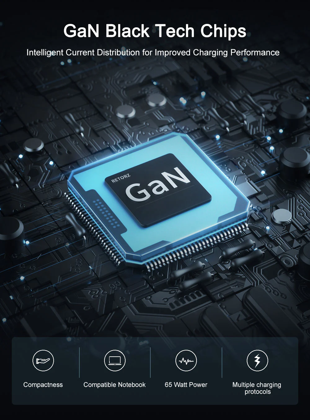 - Pikalataus: 65 W:n teho lyhentää latausaikaa, jolloin laitteesi käynnistyvät nopeasti.
